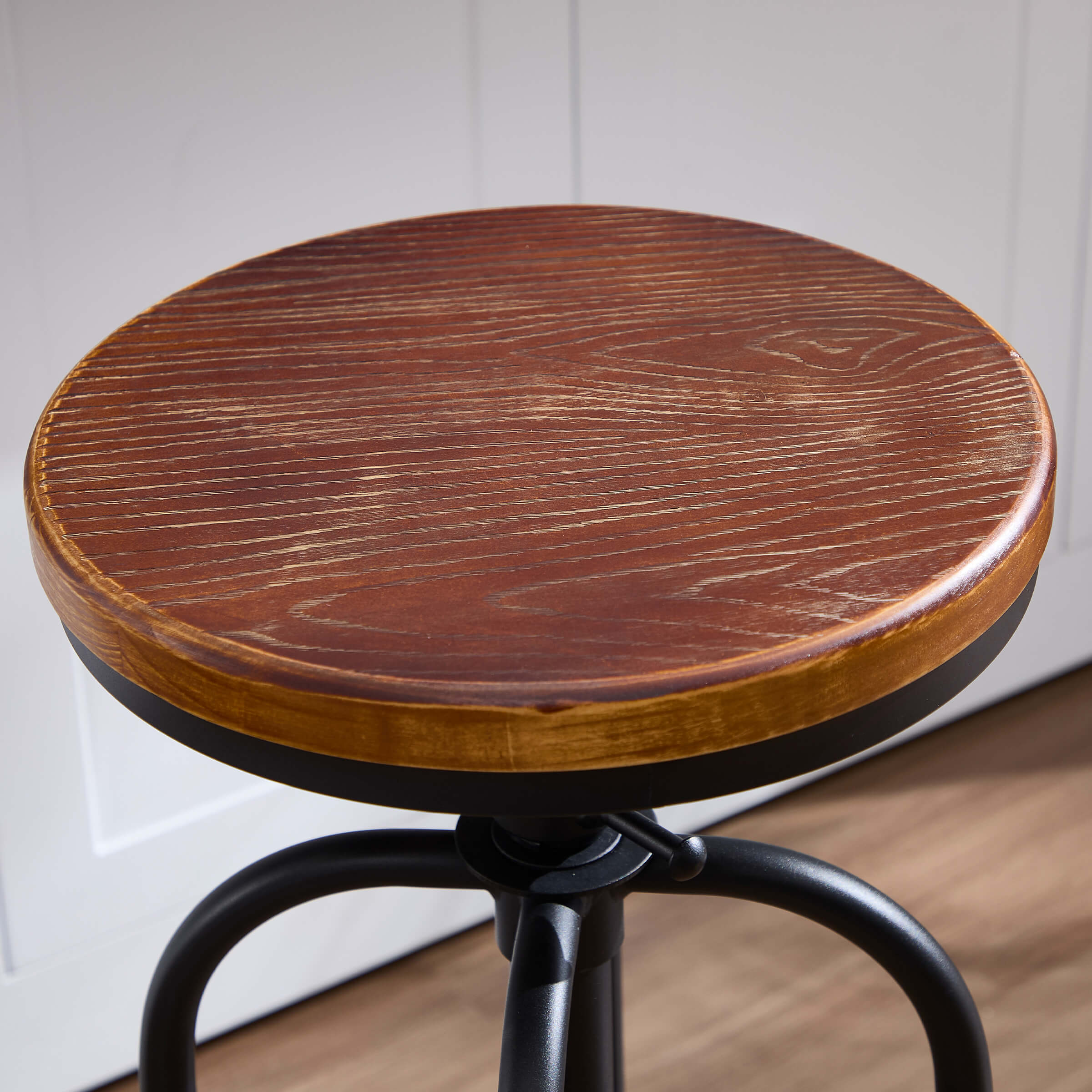 - Industrial metal frame with curved legs and wood seat adds vintage charm