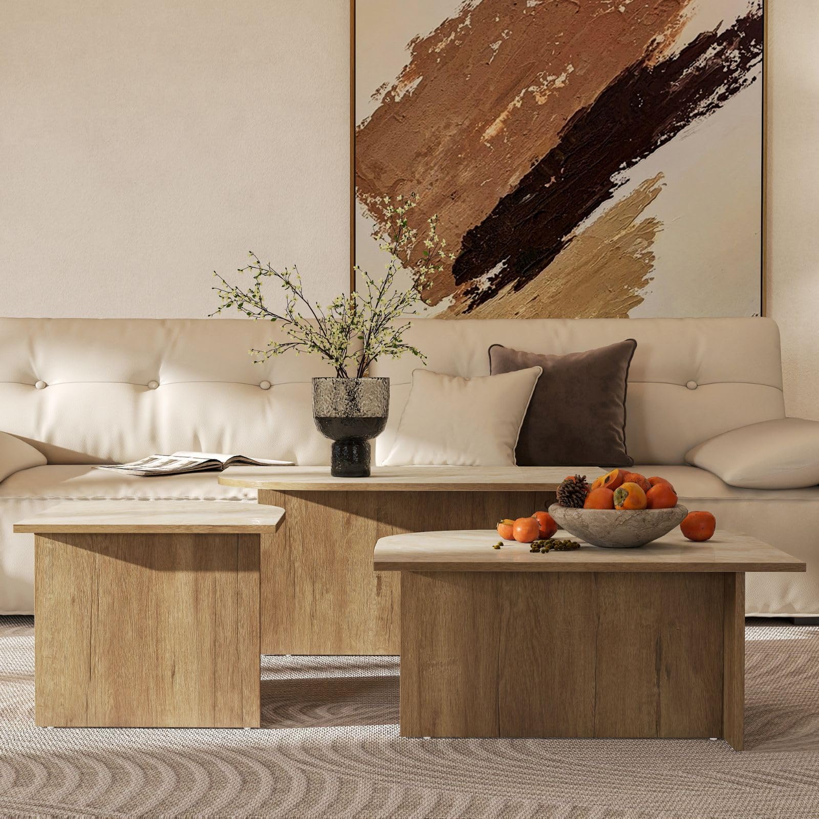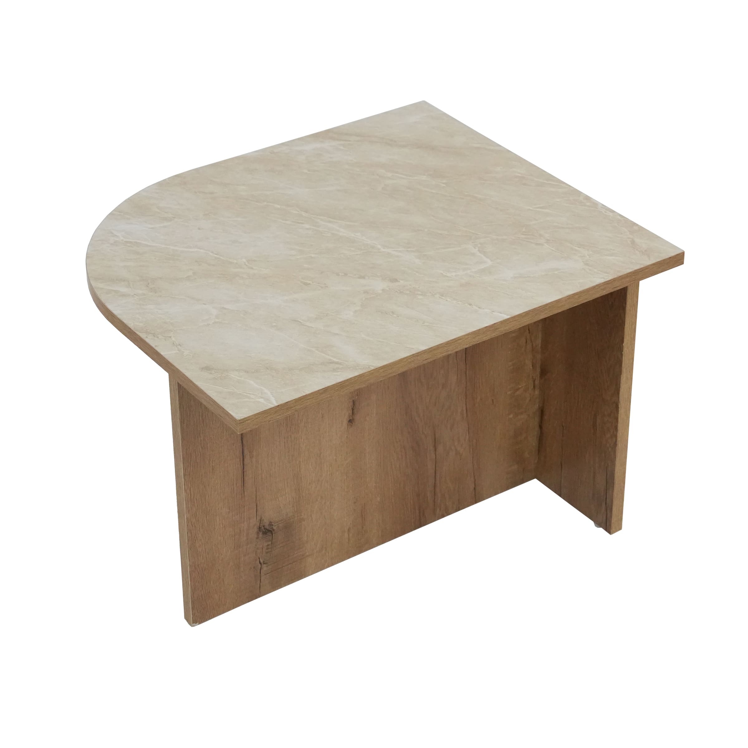 - Faux marble tops with realistic veining, paired with durable walnut-finished wood legs.