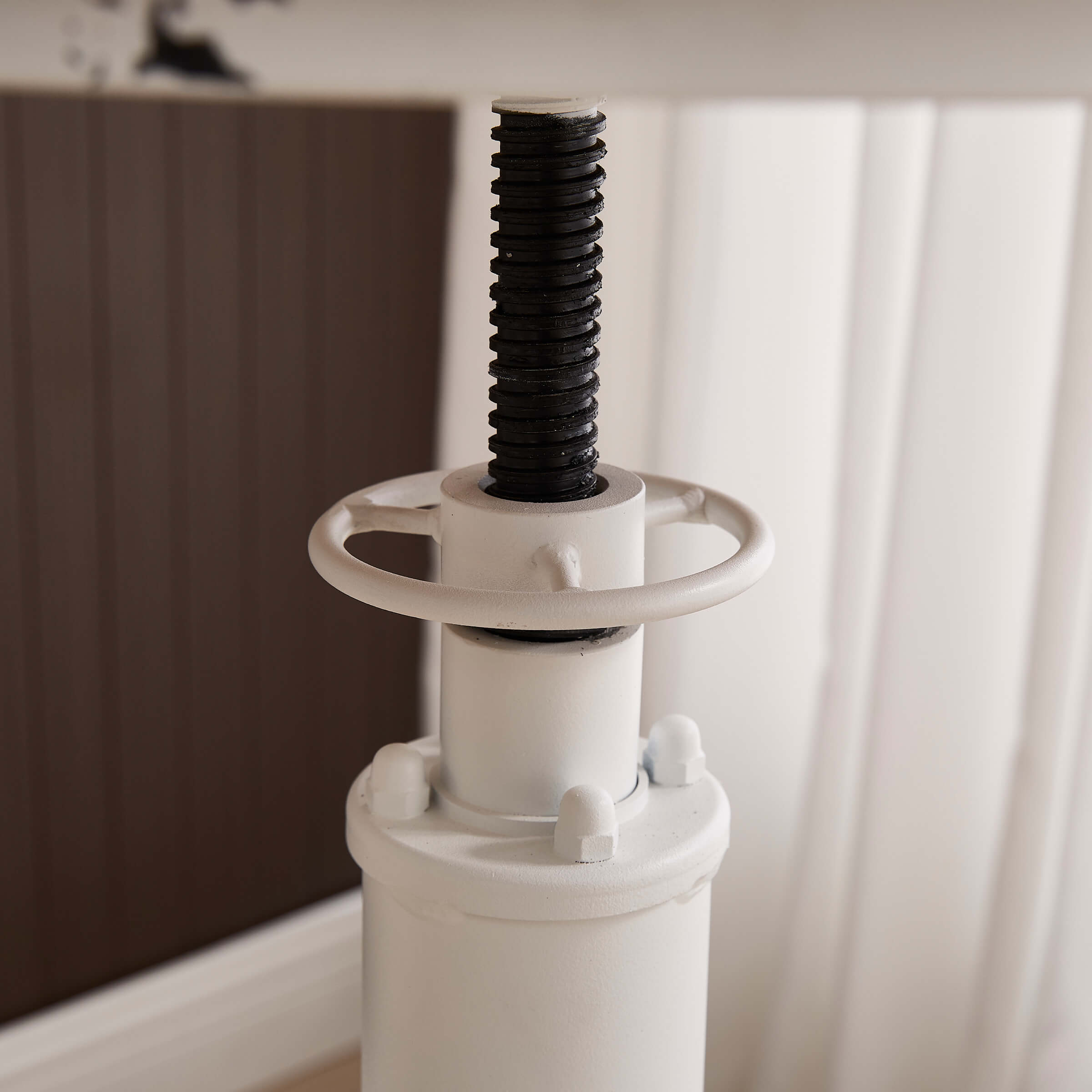 - Height adjusts from 32.75″ to 38.5″ by rotating the tabletop