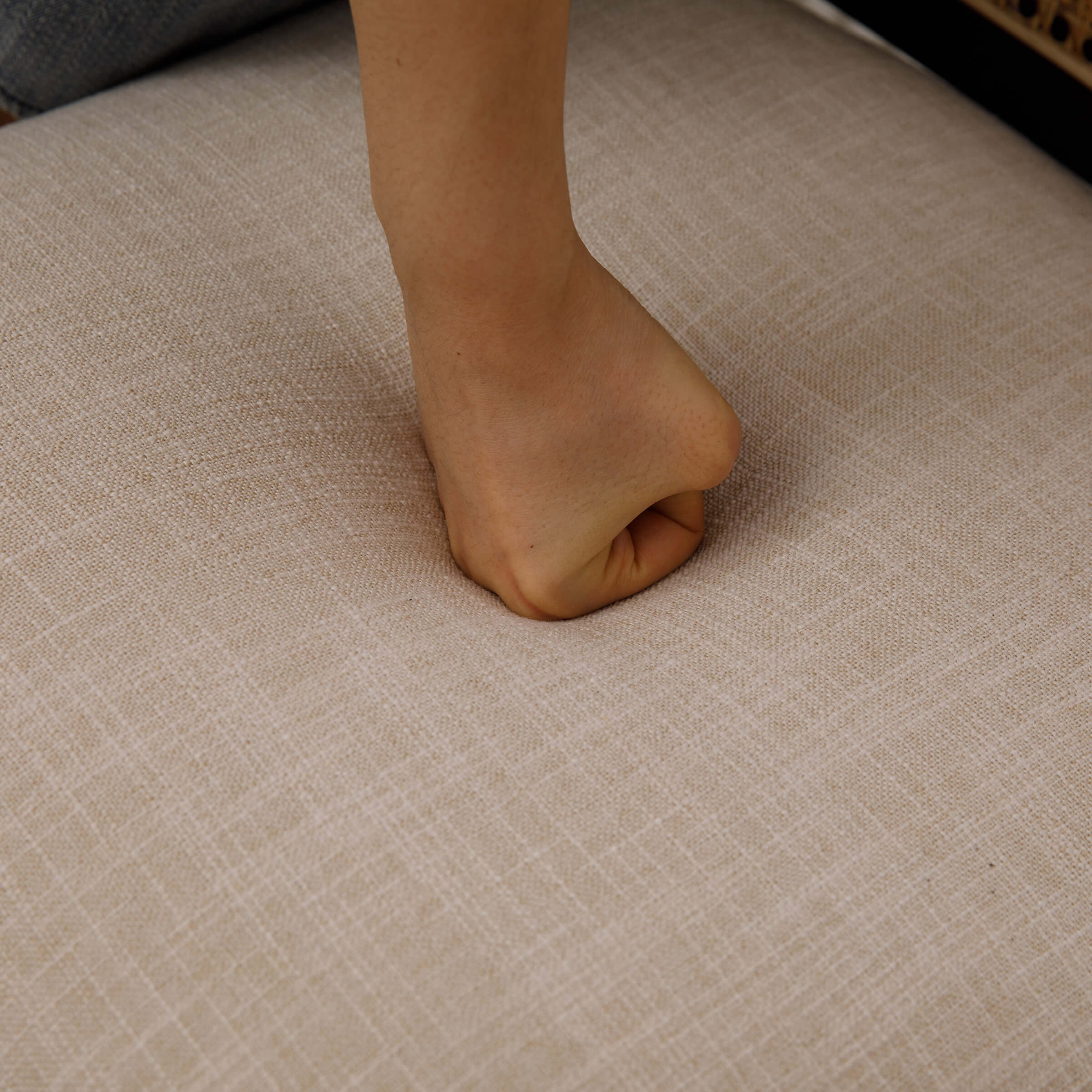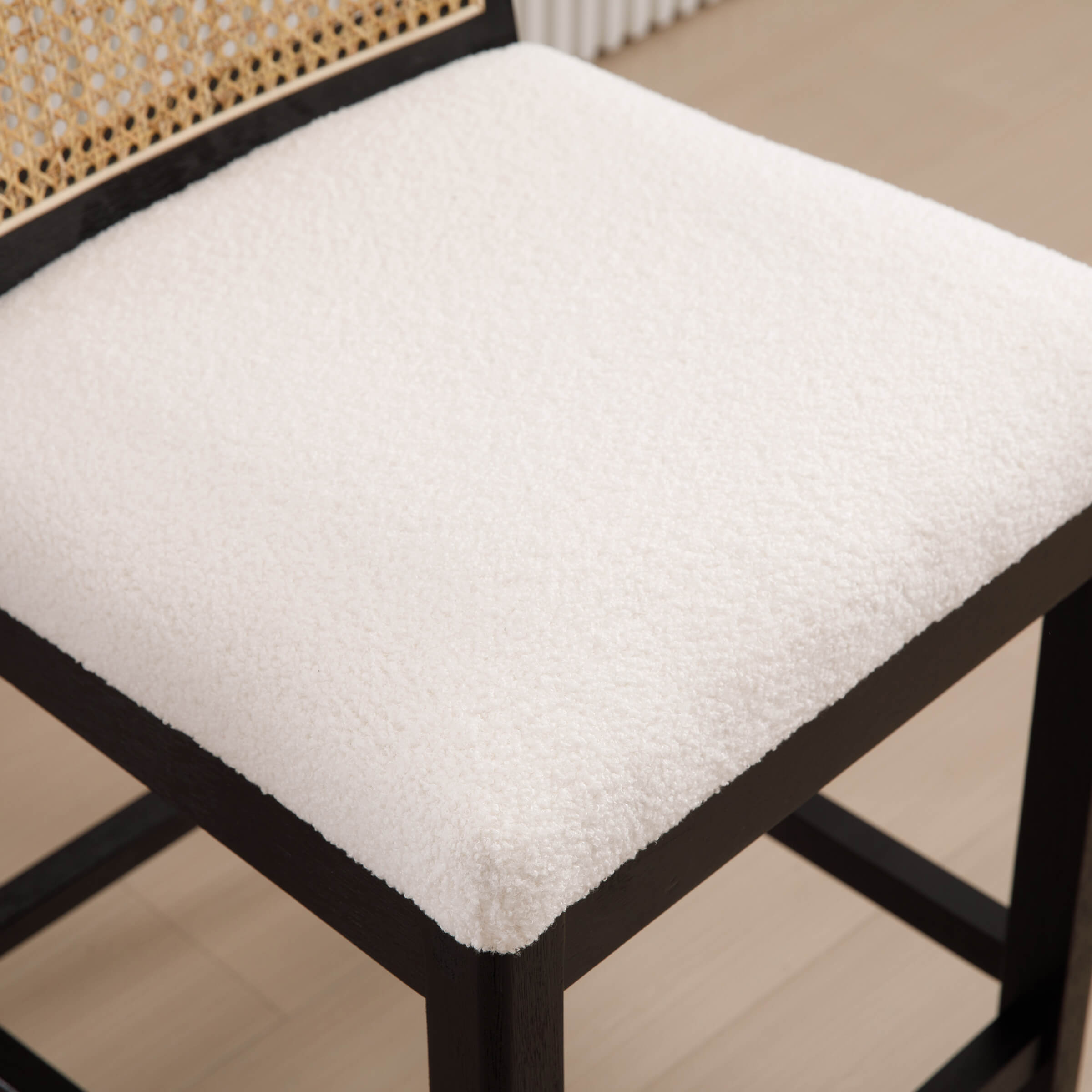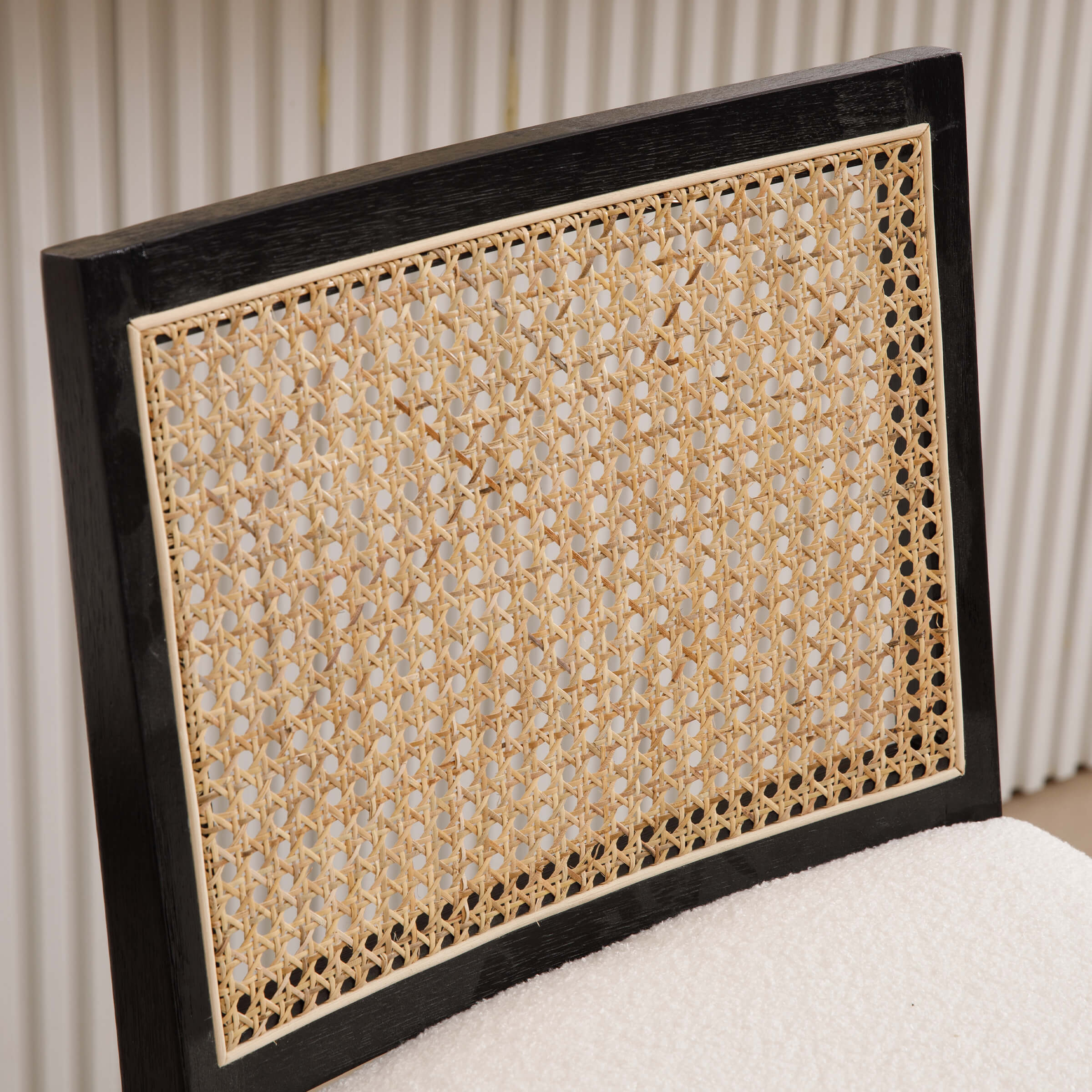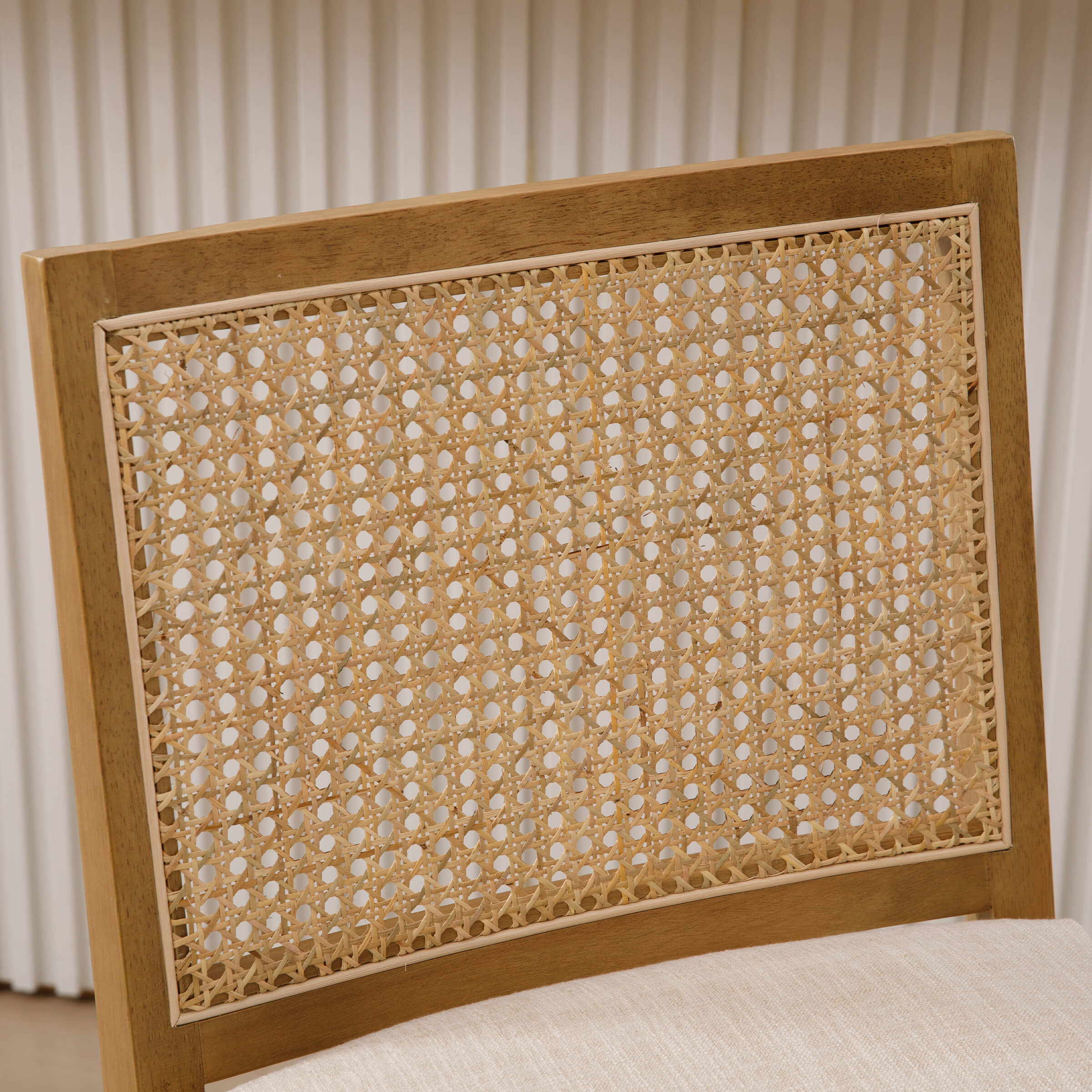 - Upholstered seat and rattan back offer breathable, cushioned comfort
