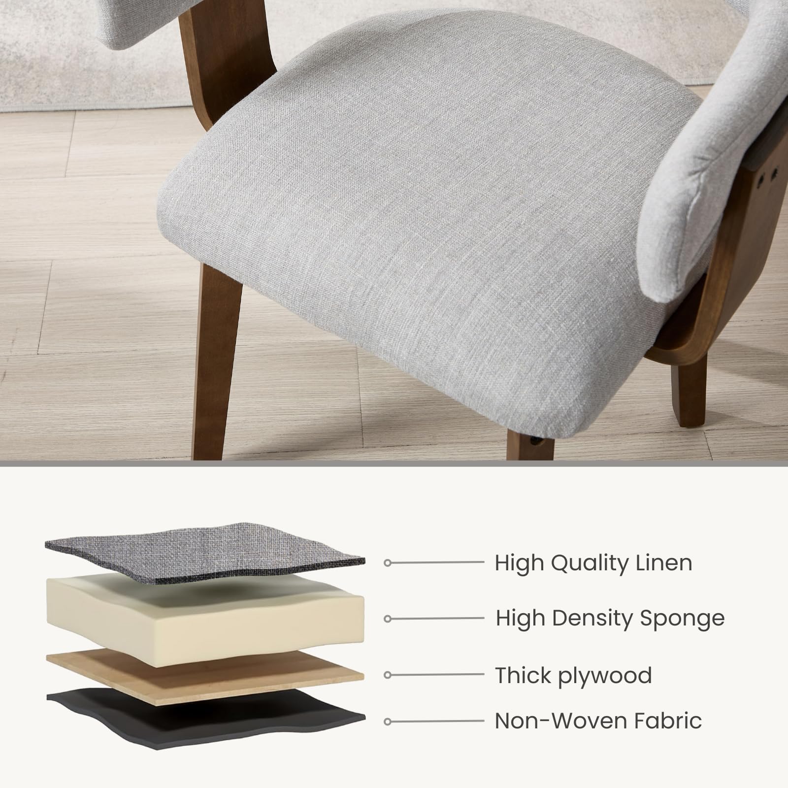 - Solid wood frame with sculpted arms adds natural charm and visual interest.