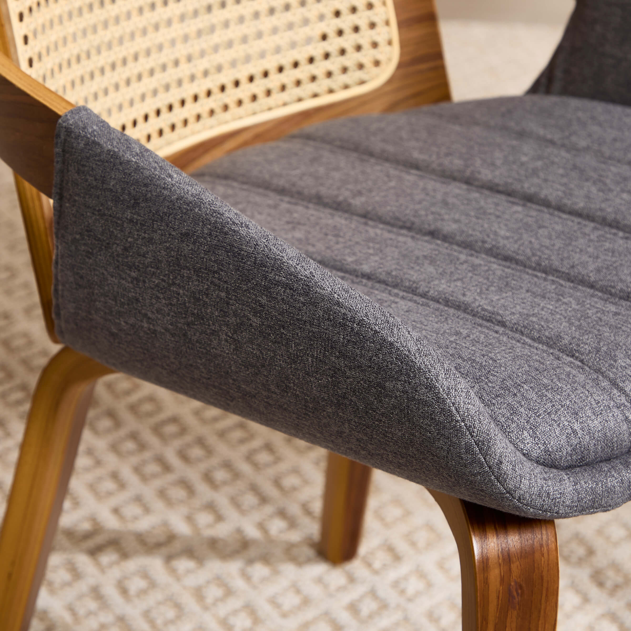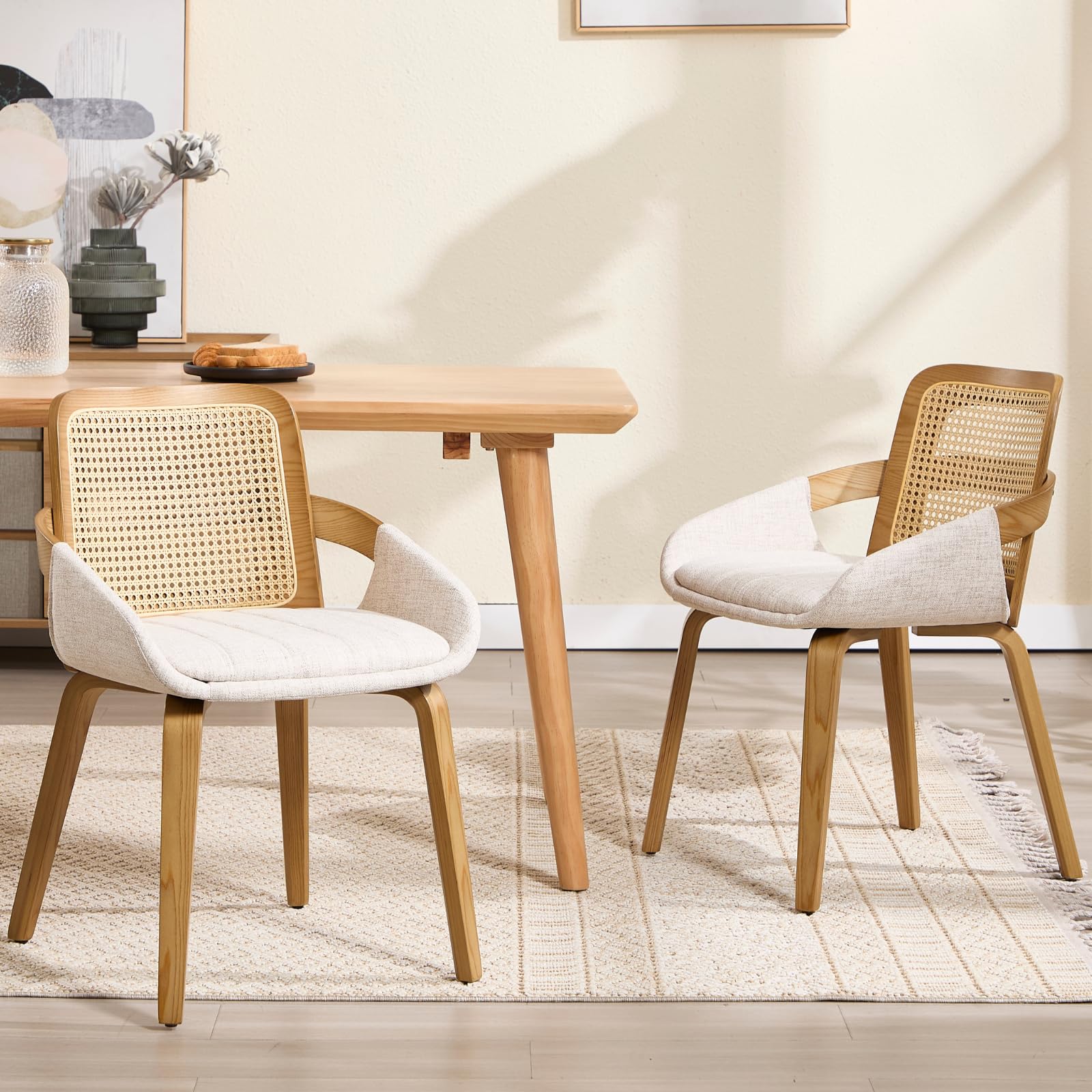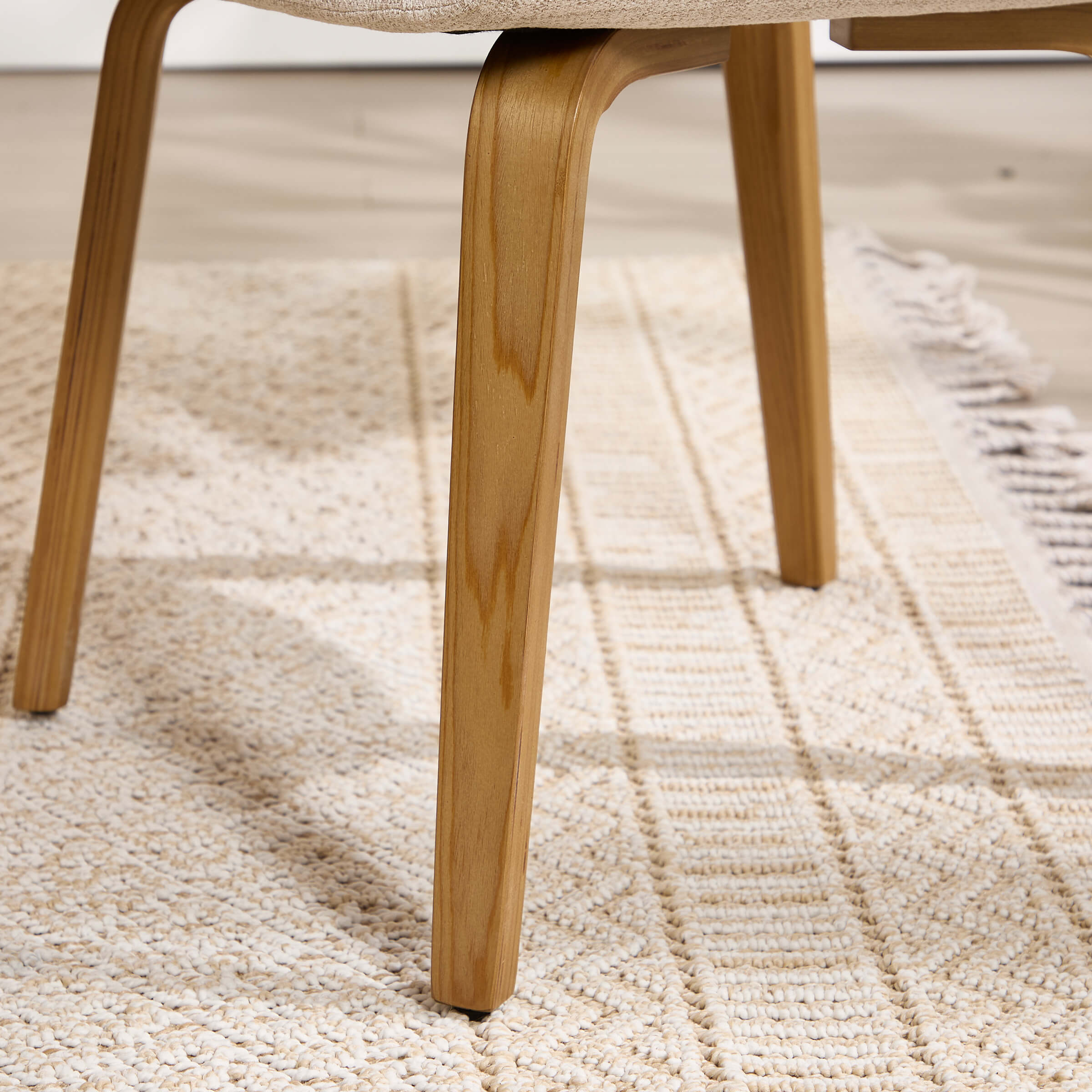 - Mid-Century modern style with natural wood grain and curved armrests complements contemporary interiors.