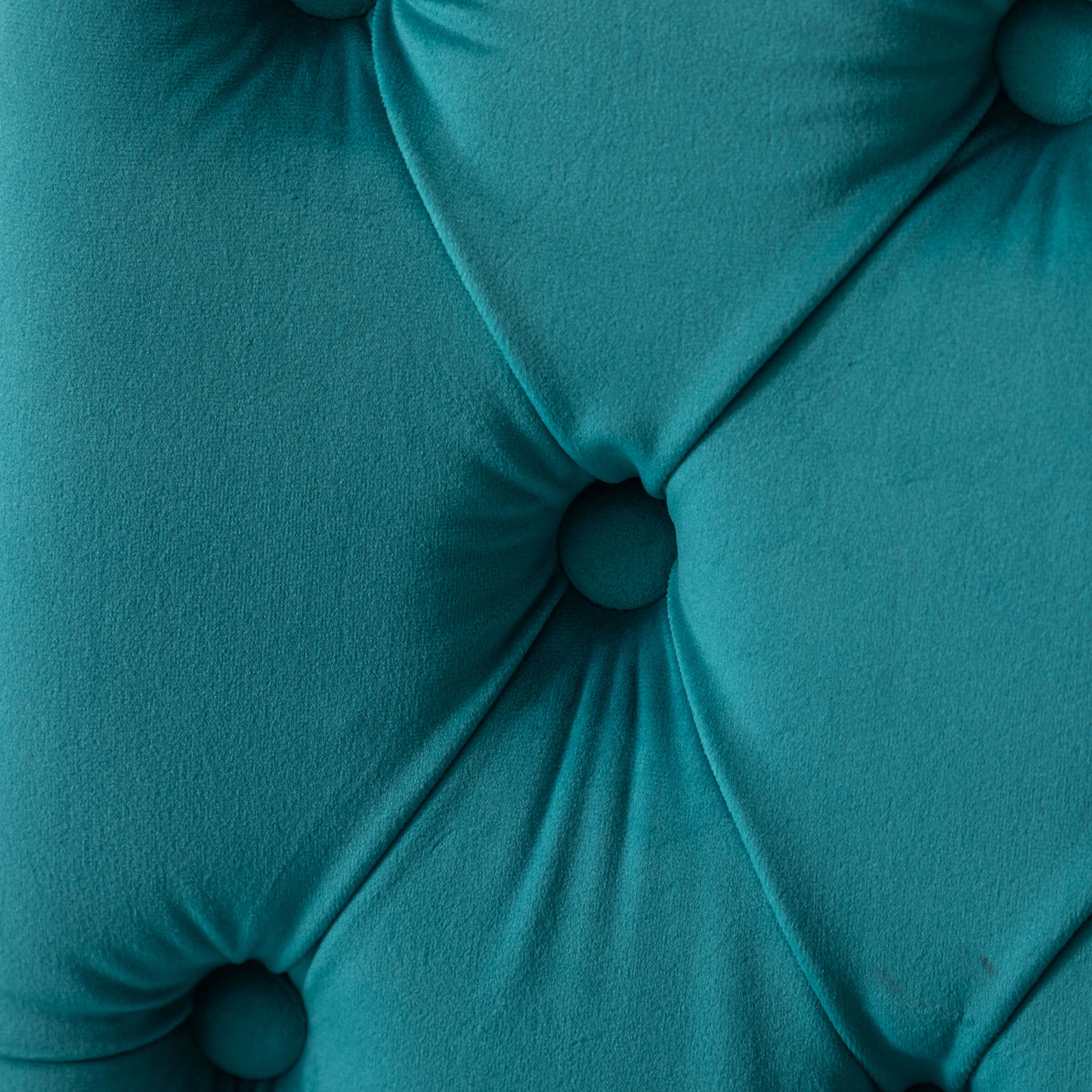 - Classic high-back silhouette with deep button tufting and neutral fabric adds French country charm.
