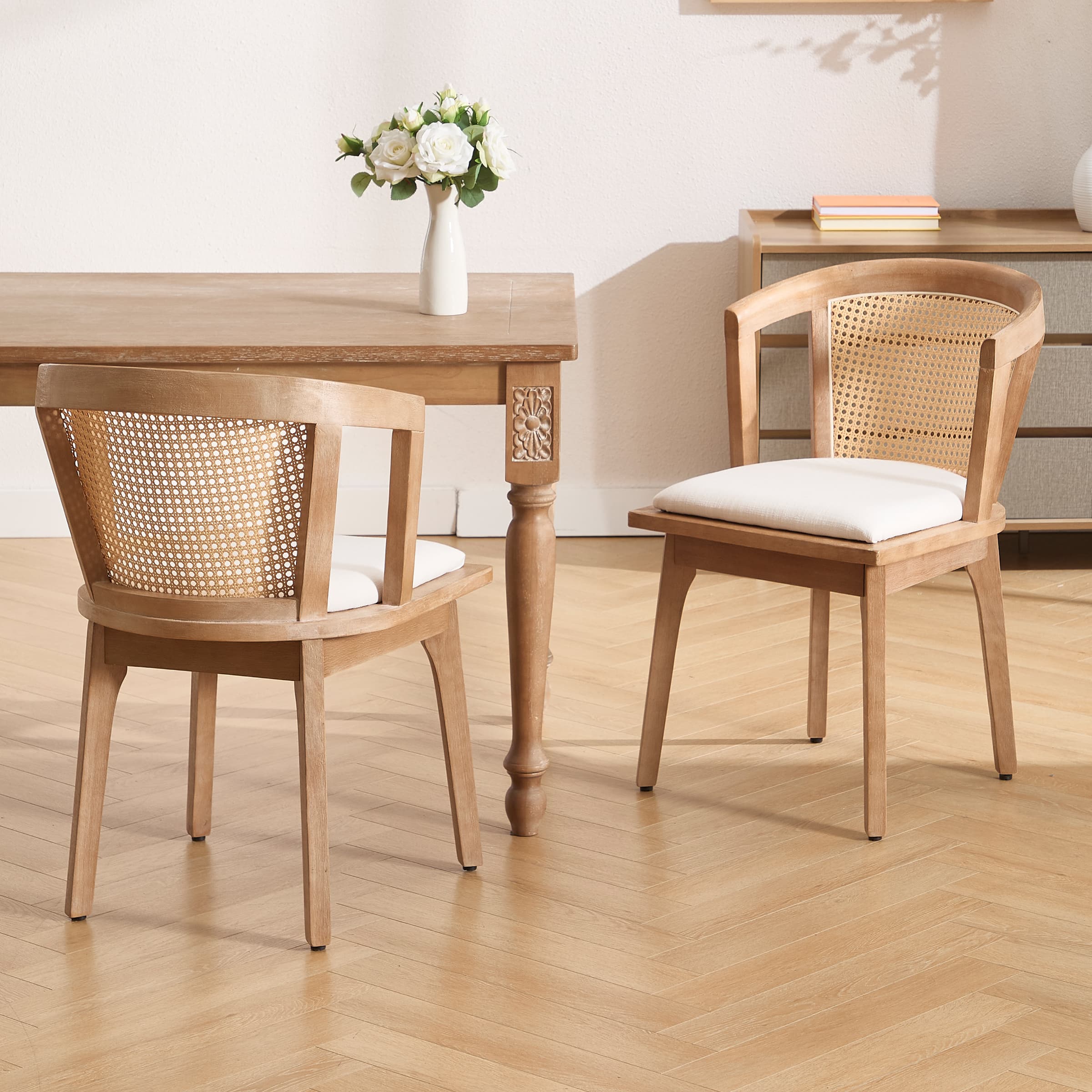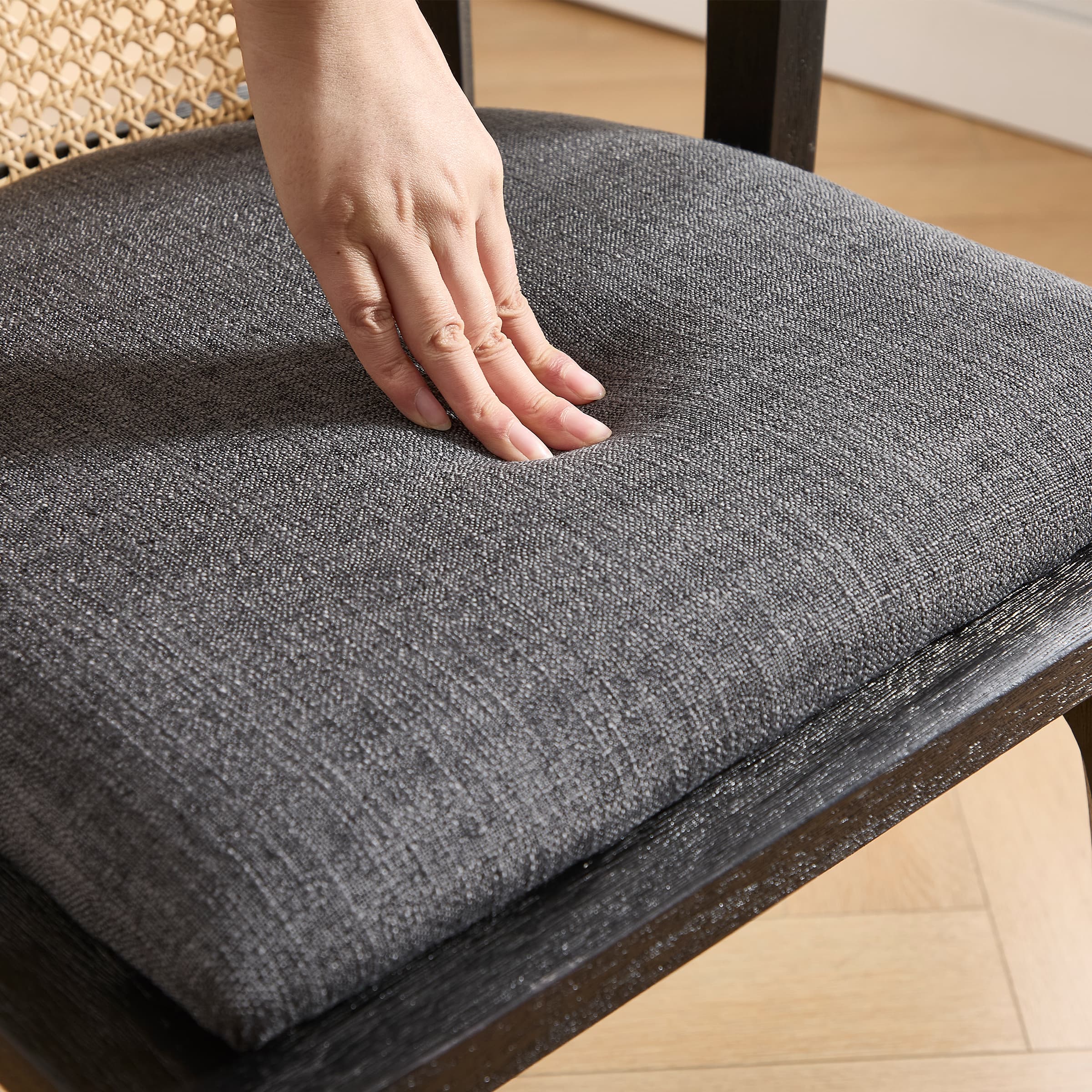- Stylish rattan back with semi-wrapped arms blends farmhouse charm and urban elegance, perfect for any occasion.