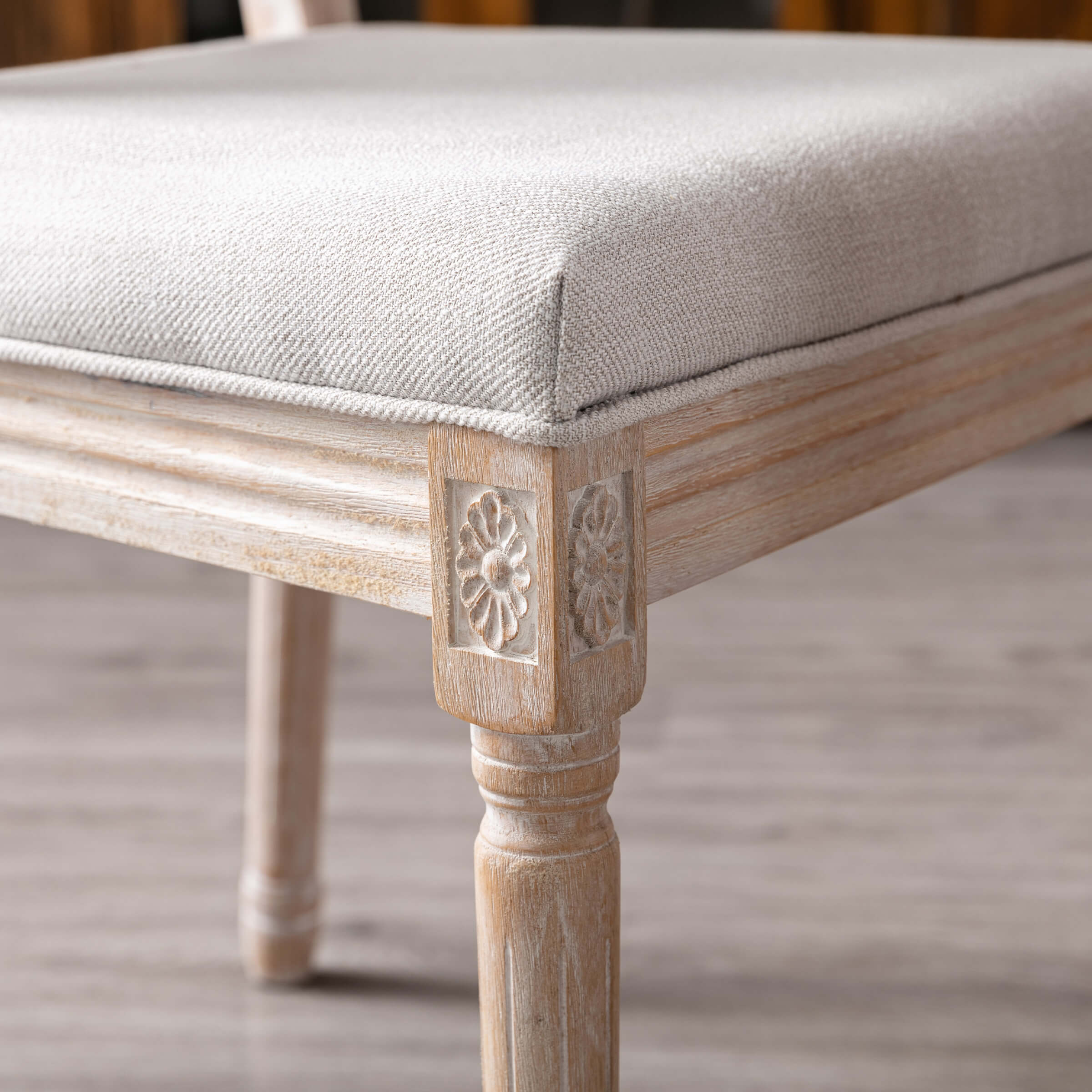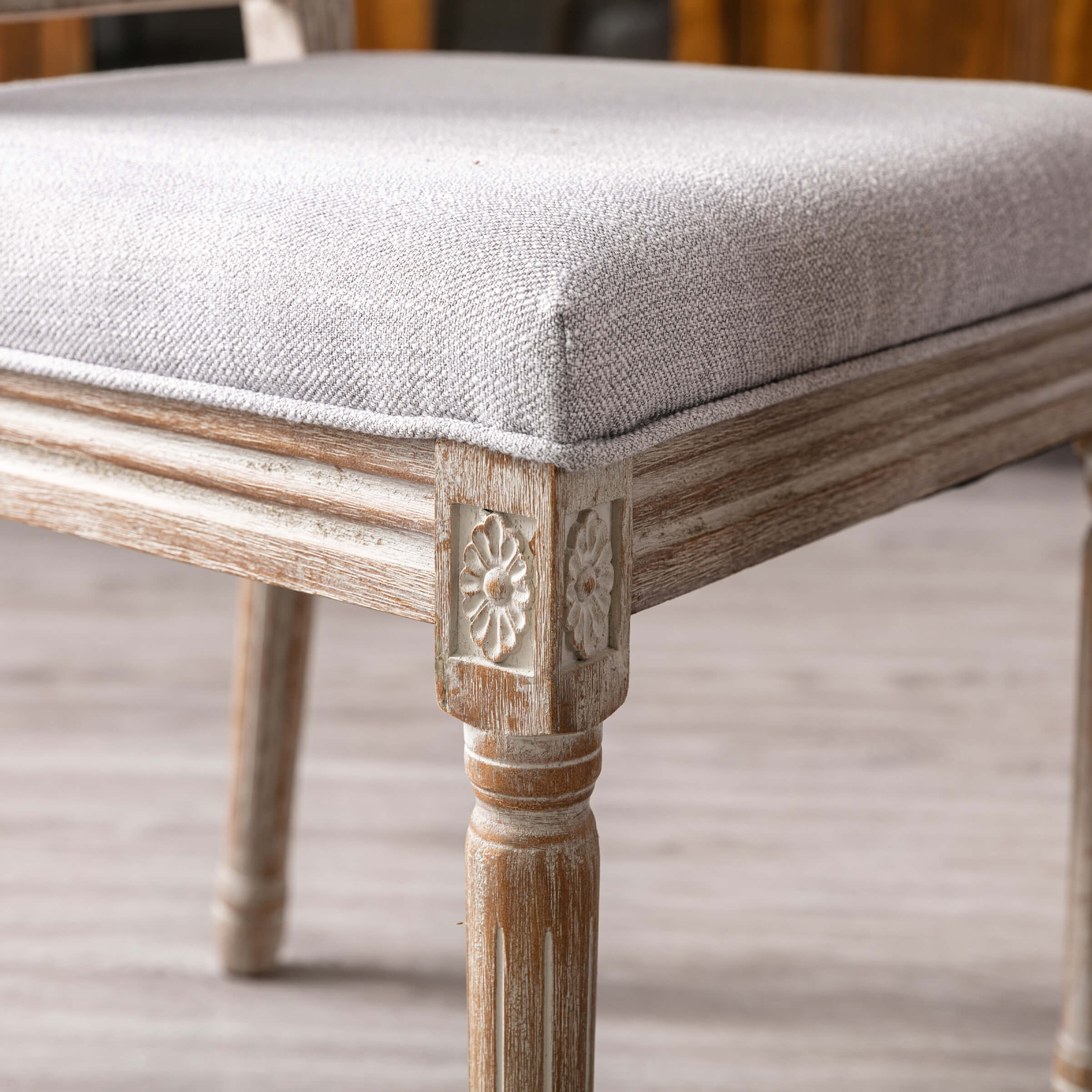 - Elegant carved details on brushed legs and rectangular back add rustic charm.