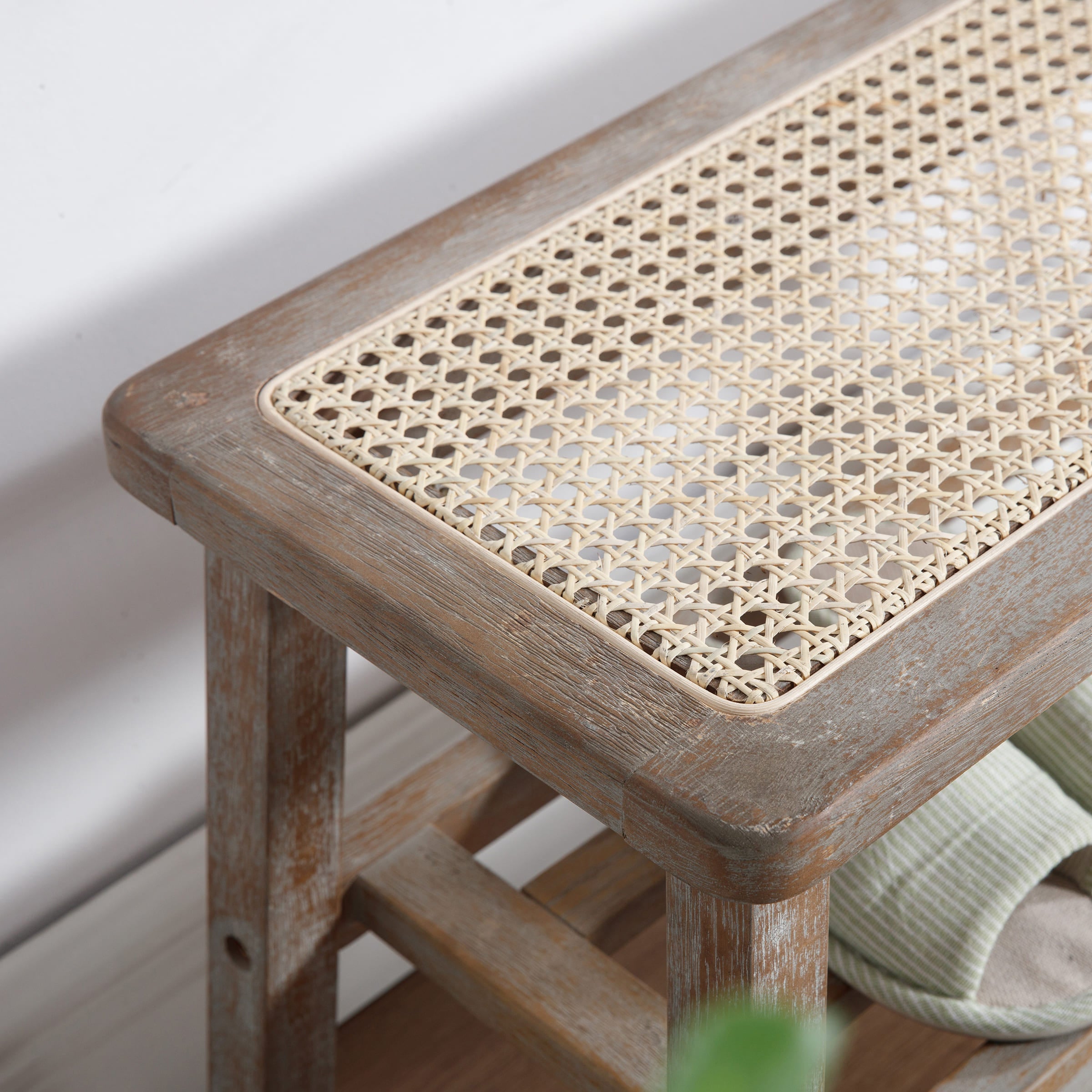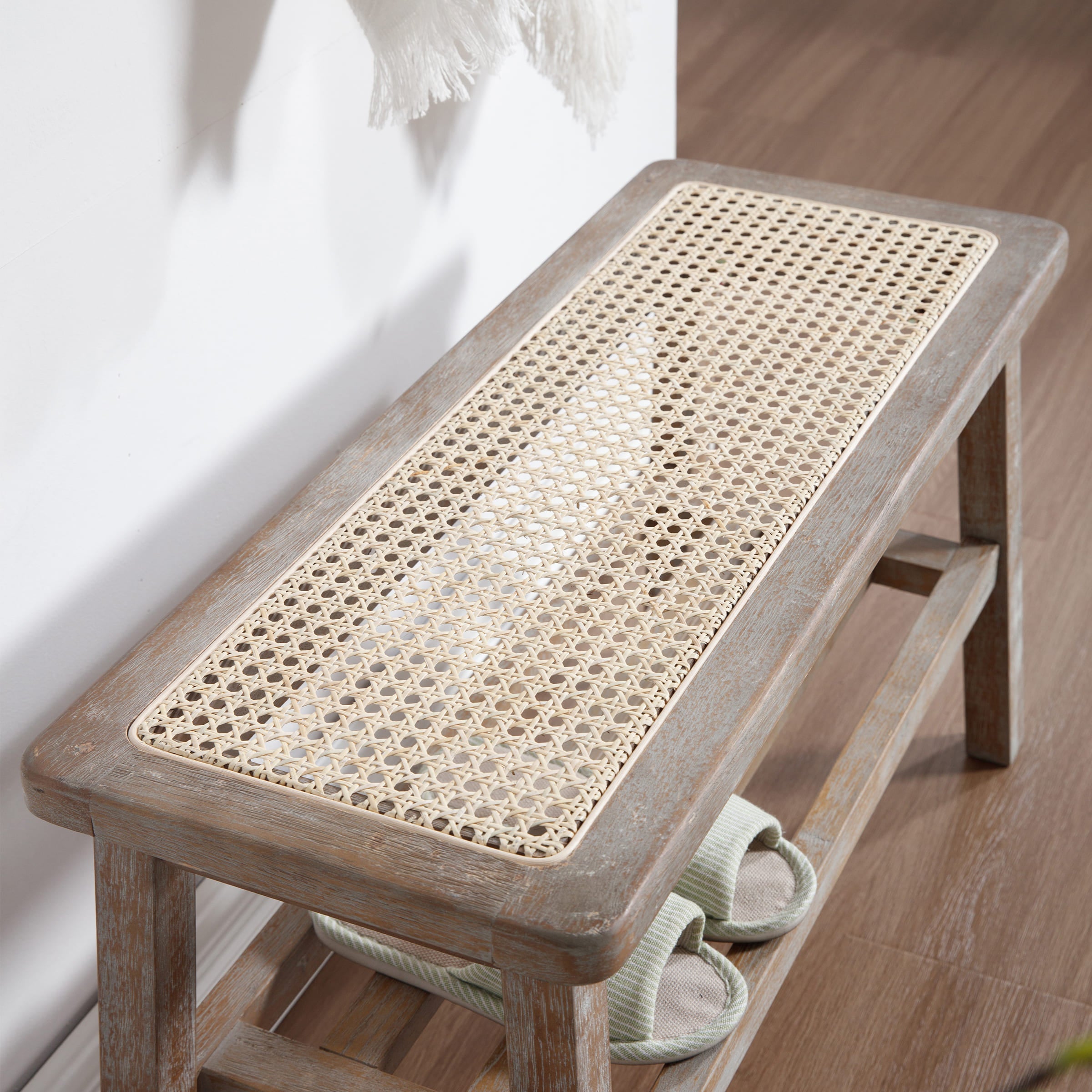 - This rattan bench combines solid wood and hand-woven seating for a natural, rustic feel that’s breathable and easy to clean.