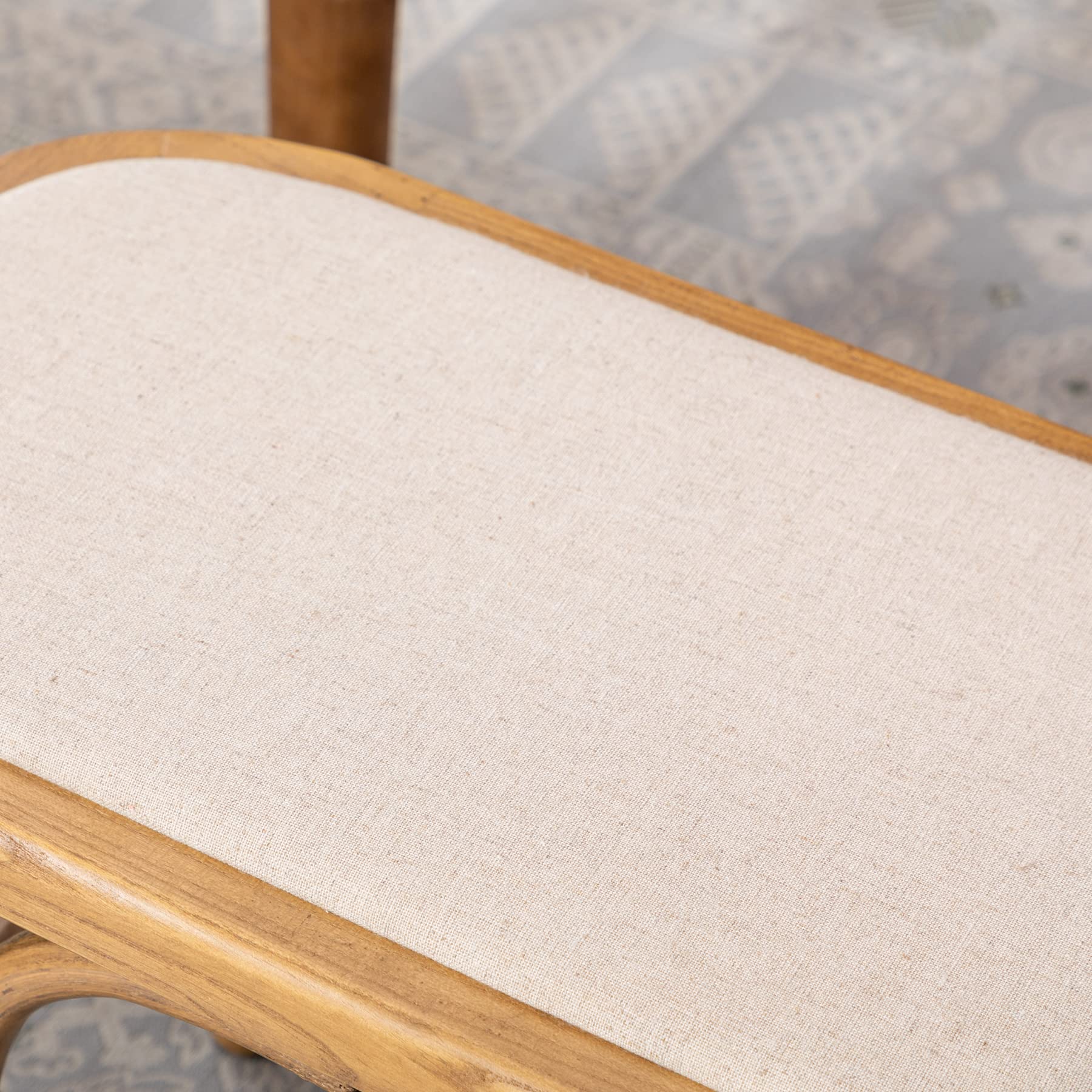 - Rustic farmhouse bench made of solid oak with natural finish.