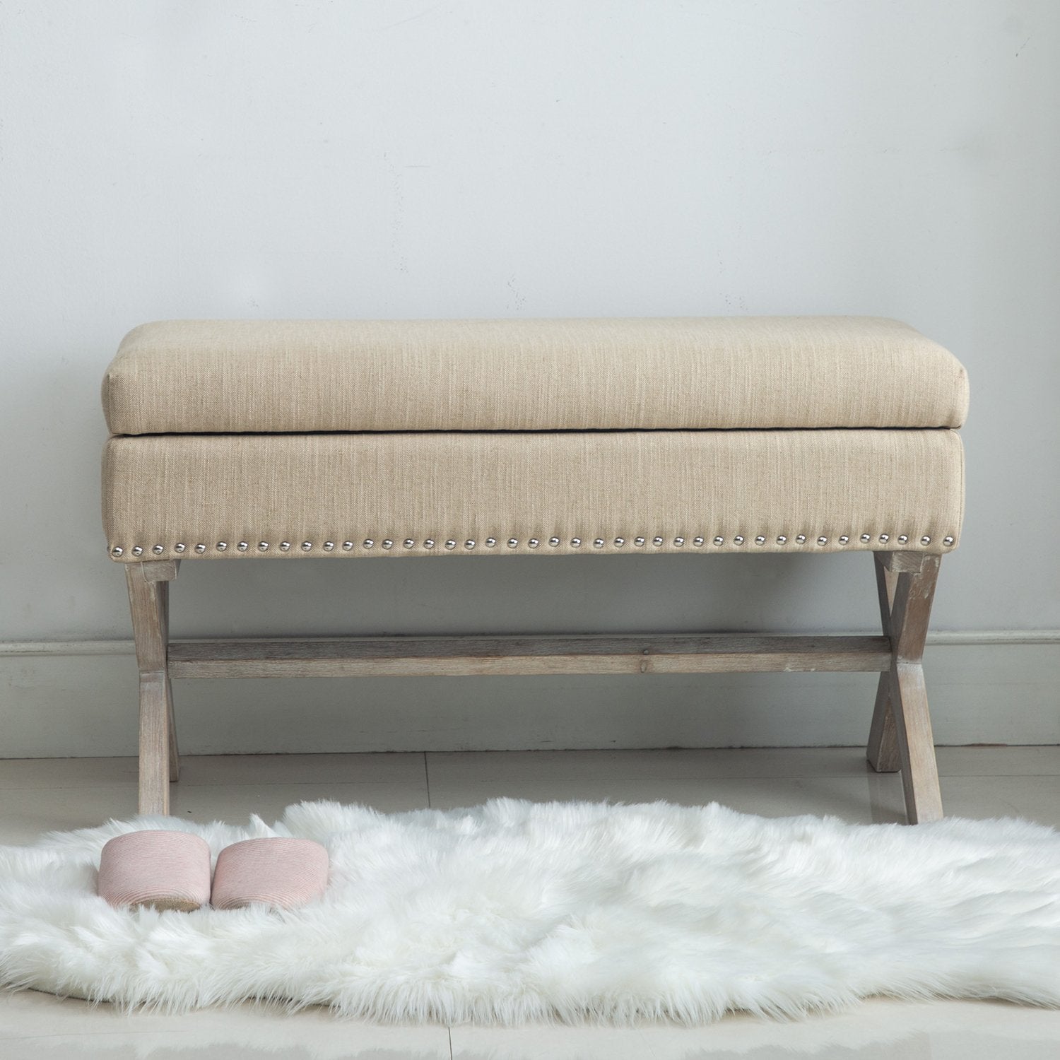 - The sleek rectangular design of our storage entryway ottoman bench is specious and fashionable. The X-shaped rubber wood legs look very stylish
