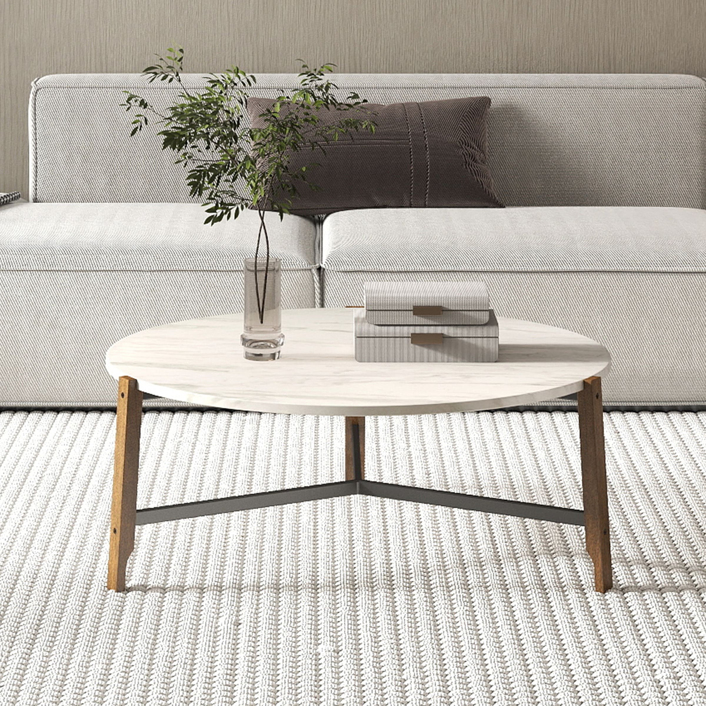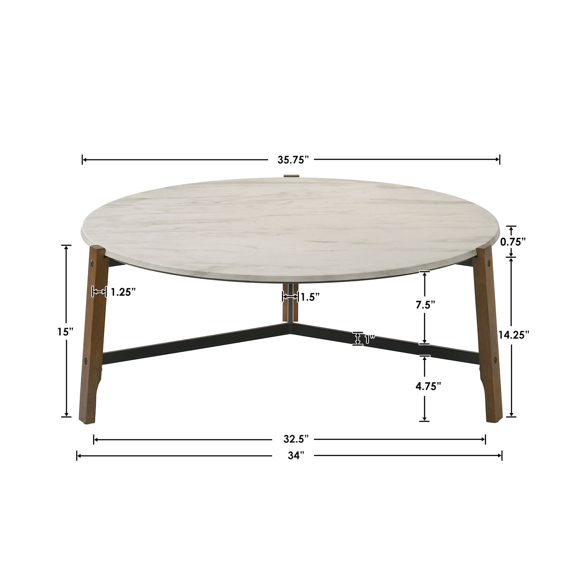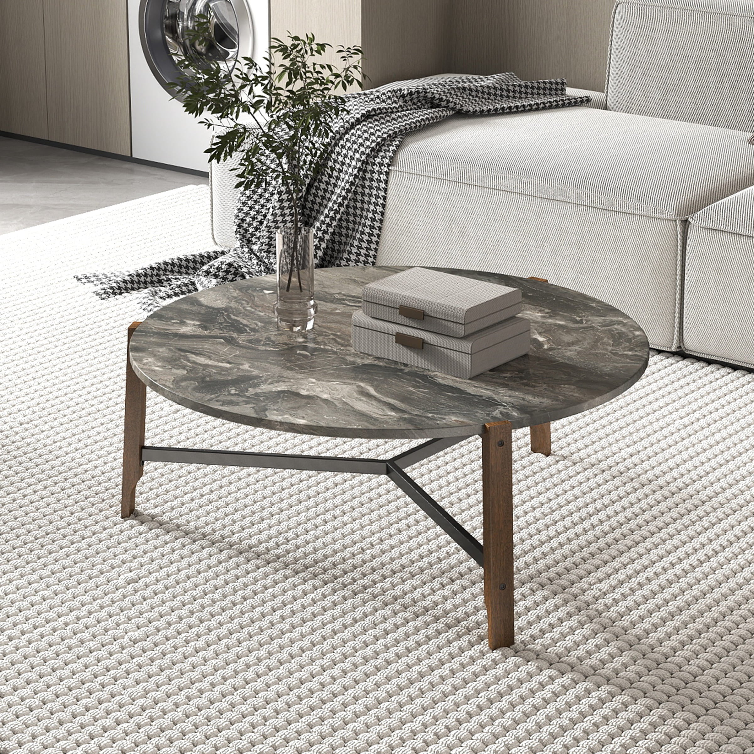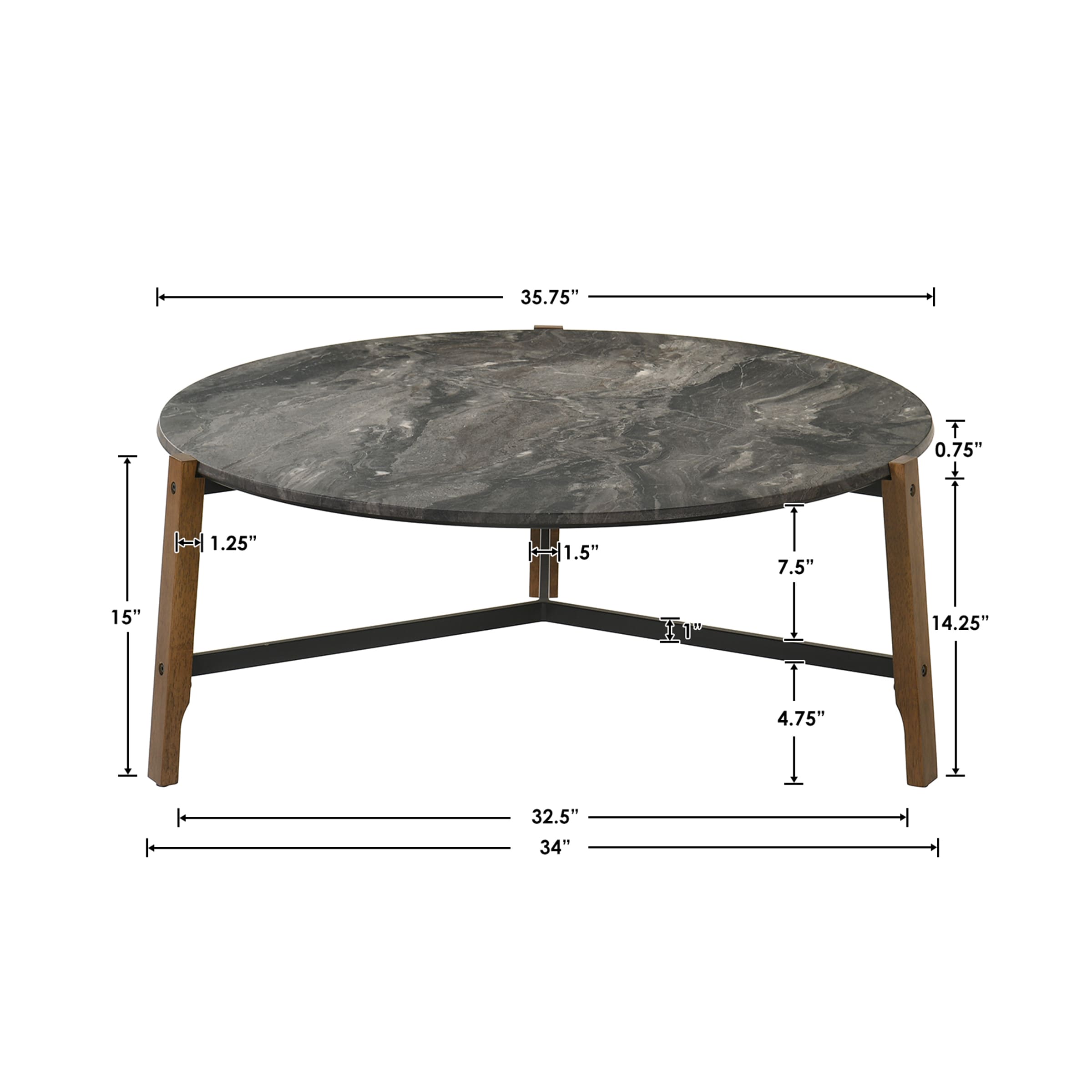 - Round coffee table with wooden top and legs, metal support, brings fresh mid-century look.