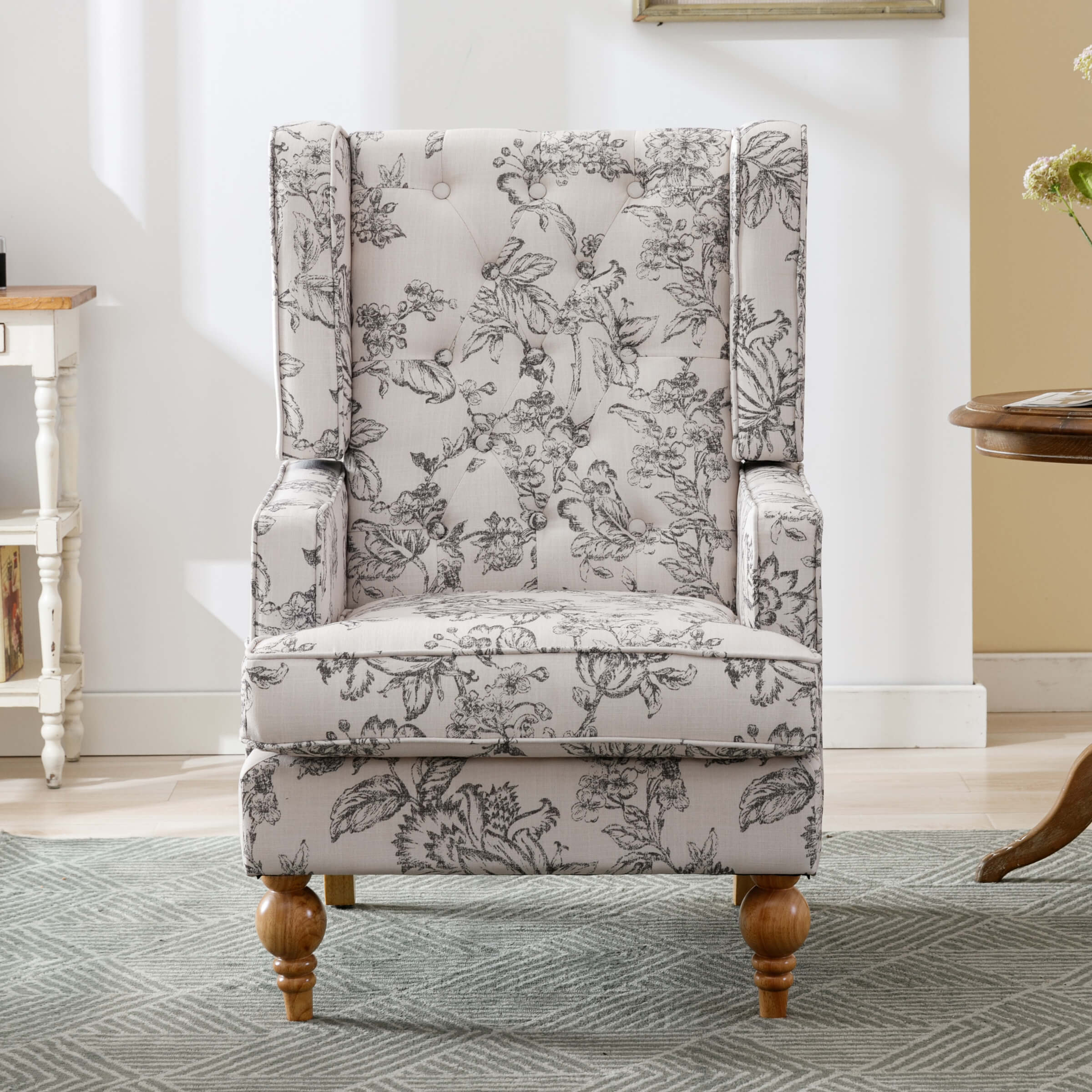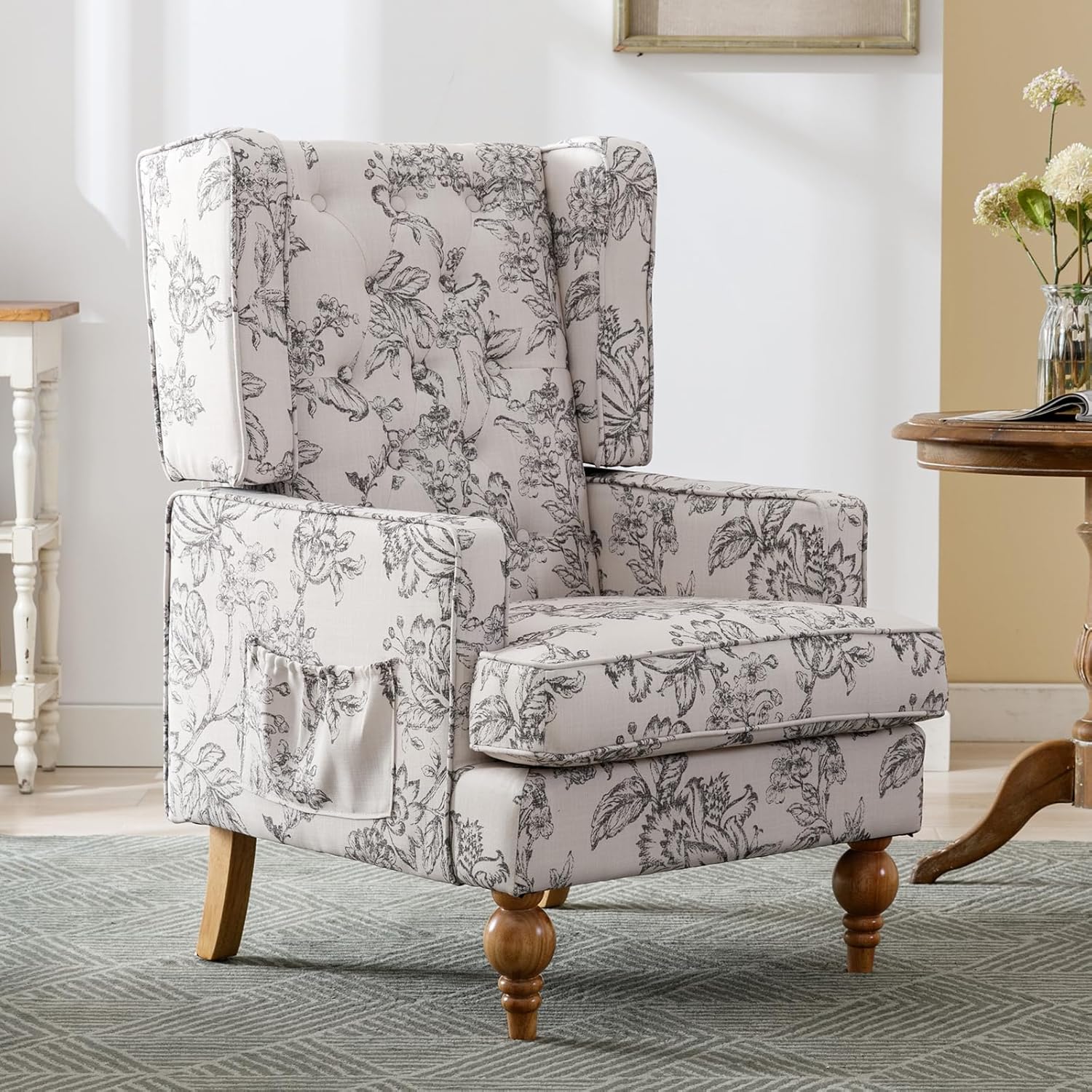Classic Wingback DesignSpacious & Soft BackrestComfy Removable Seat CushionConvenient Side PocketNice Gourd-shaped FootProduct Dimensions