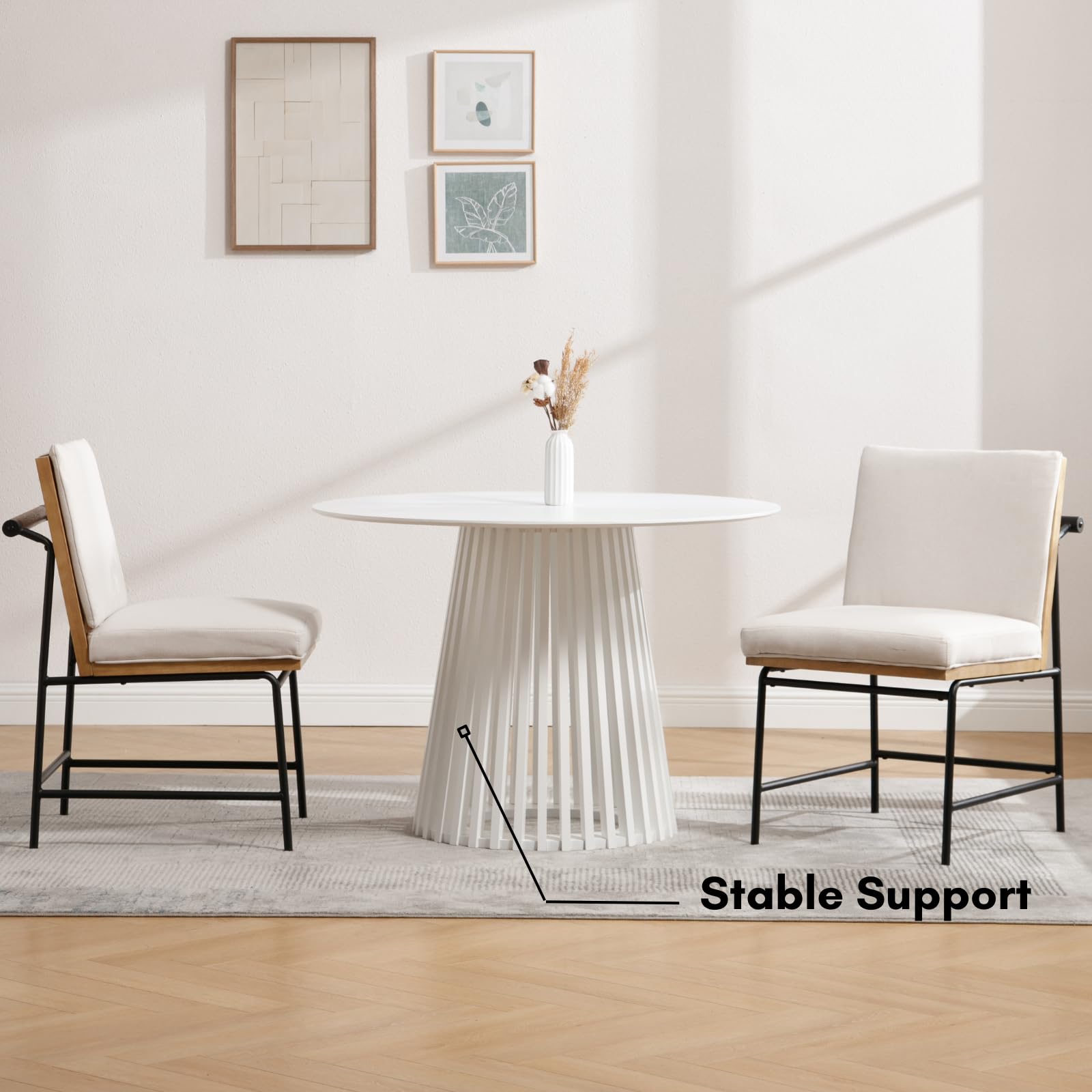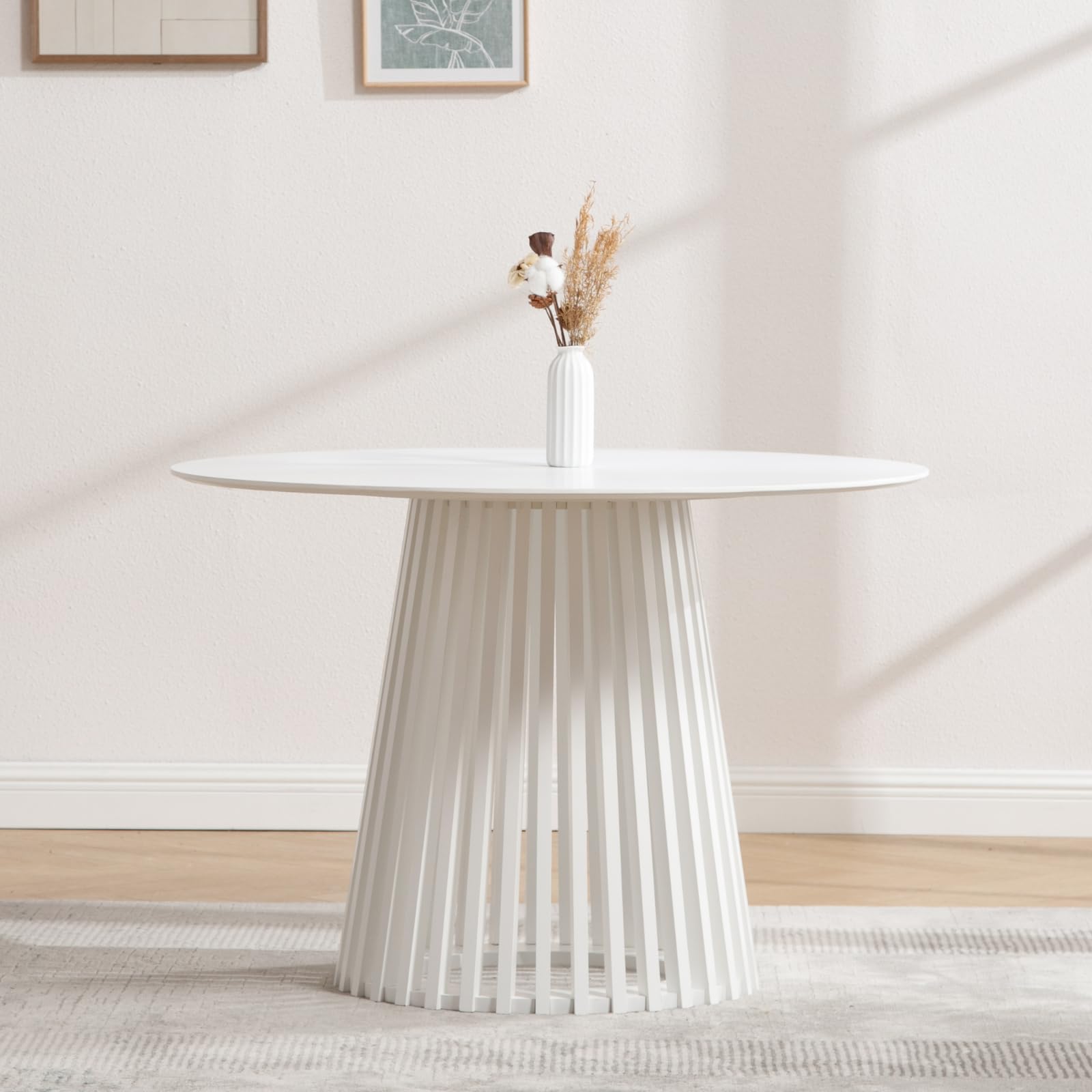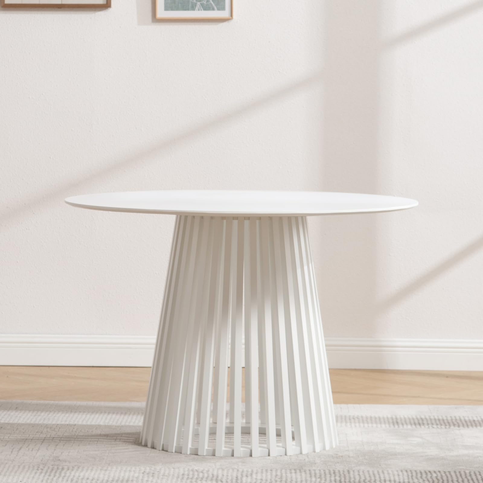 - Minimalist round pedestal table fits most home styles.
