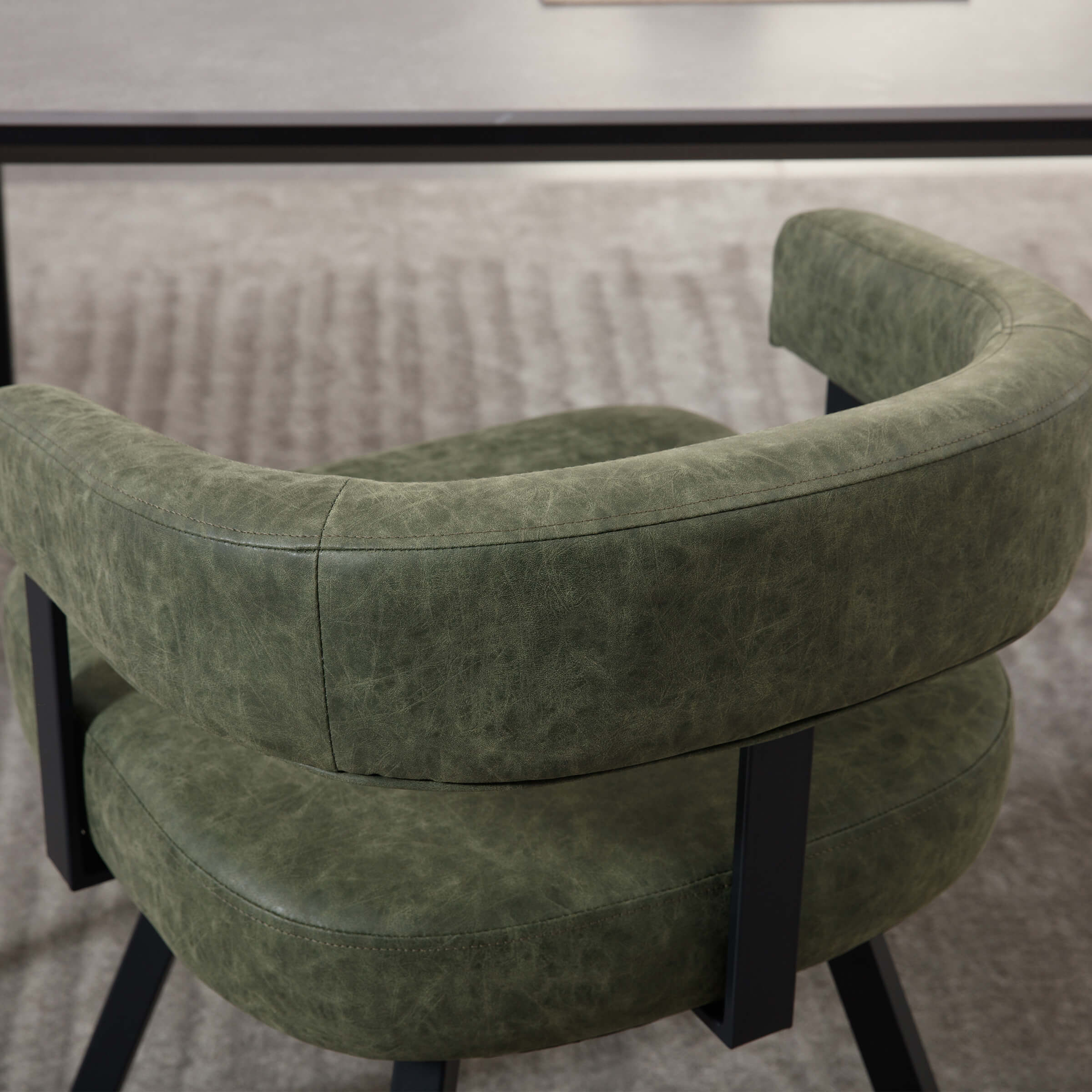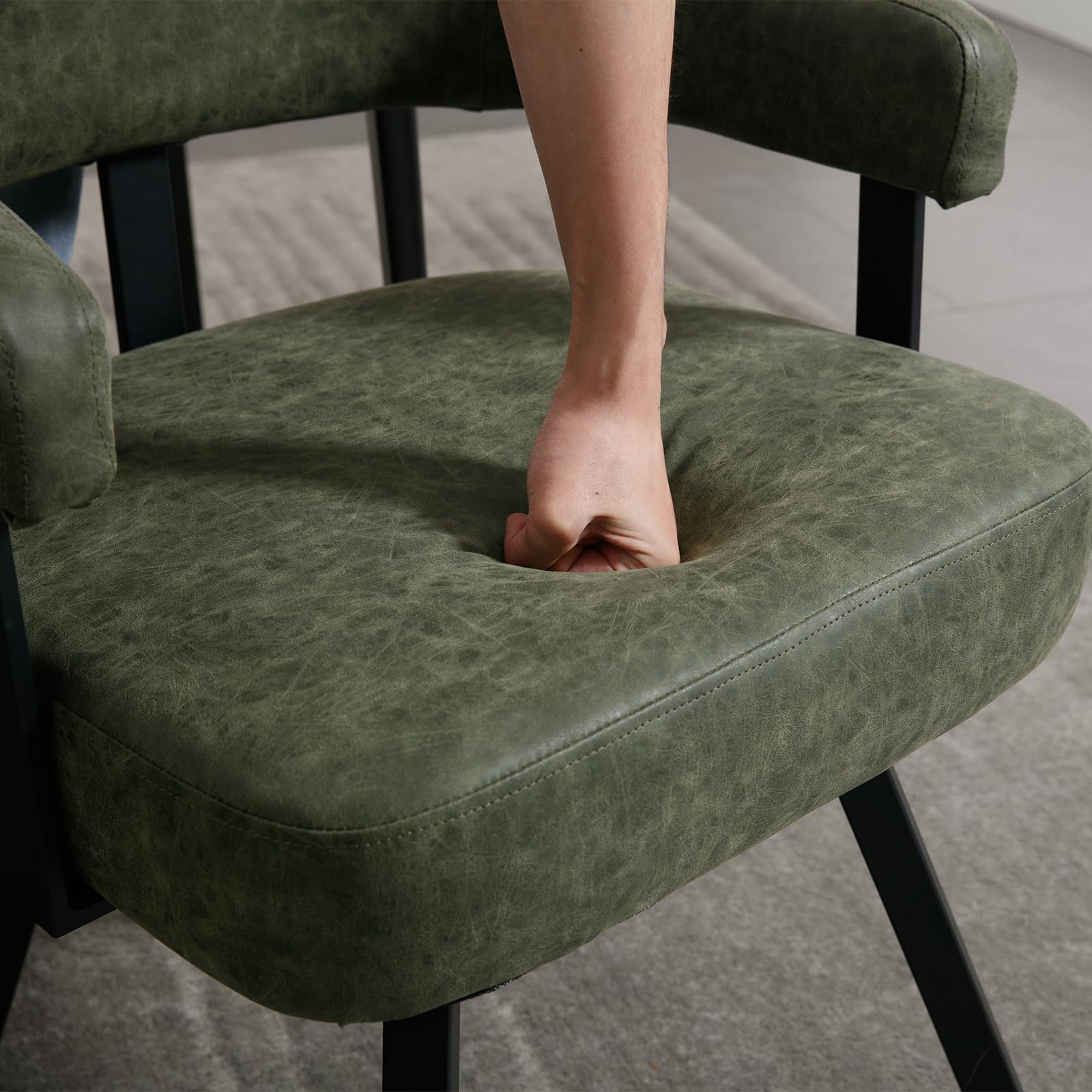 - Sturdy matte black metal frame with padded chenille or faux leather seat; foot pads protect floors.