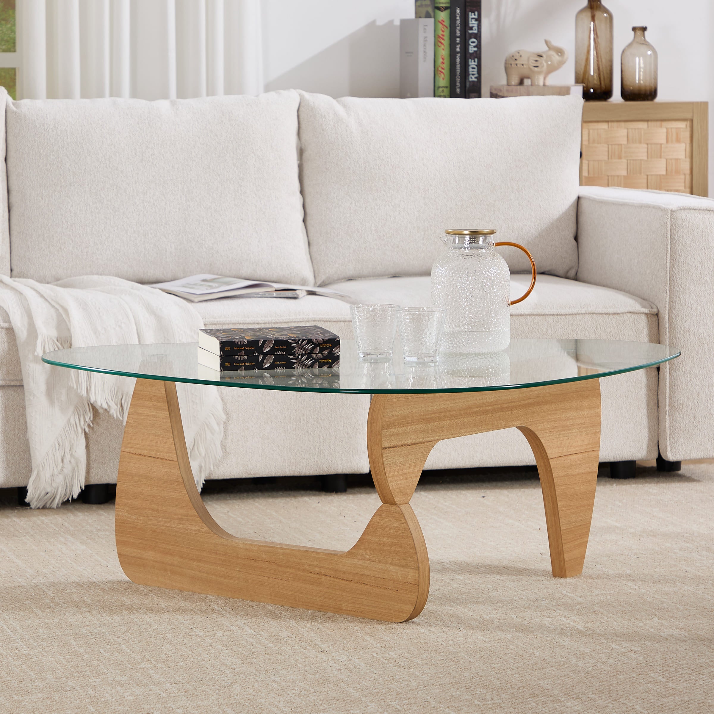 - Eye-catching triangular glass top pairs with a solid wood base for modern style.