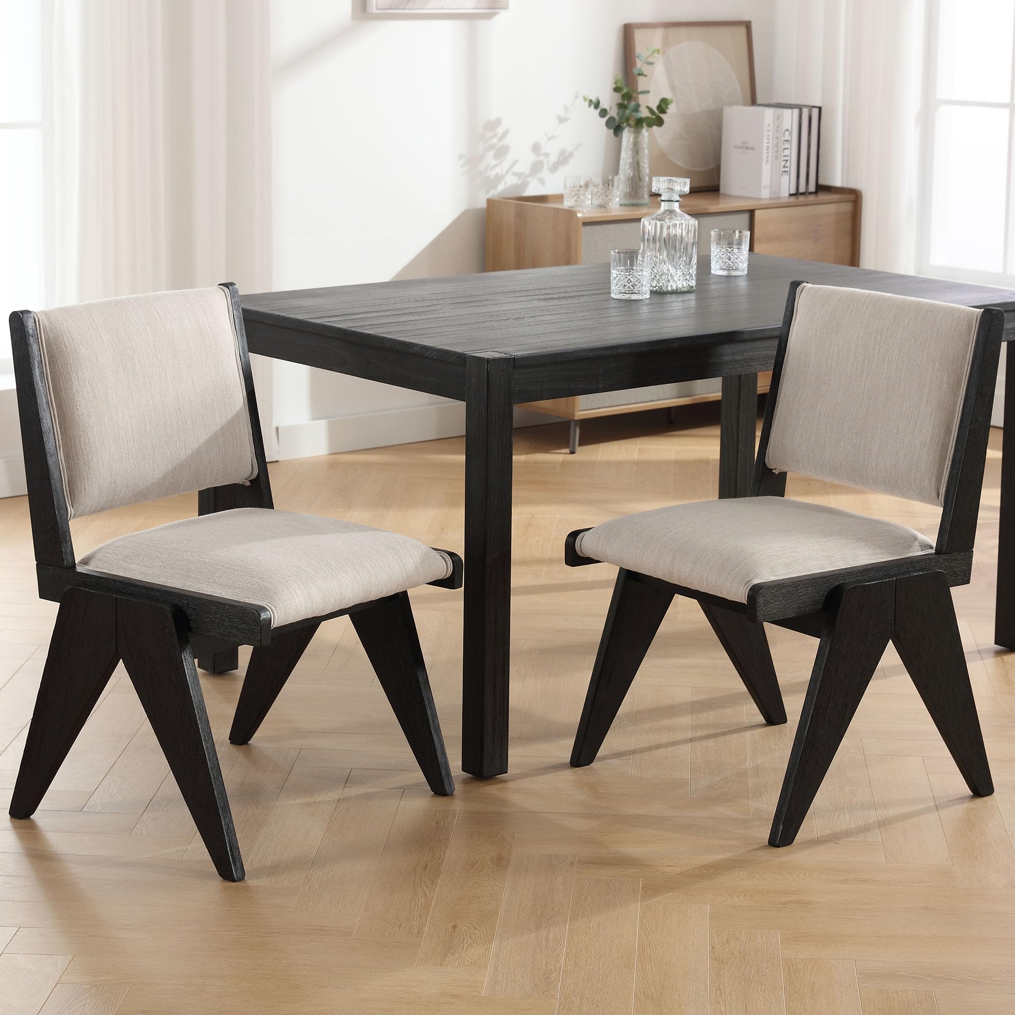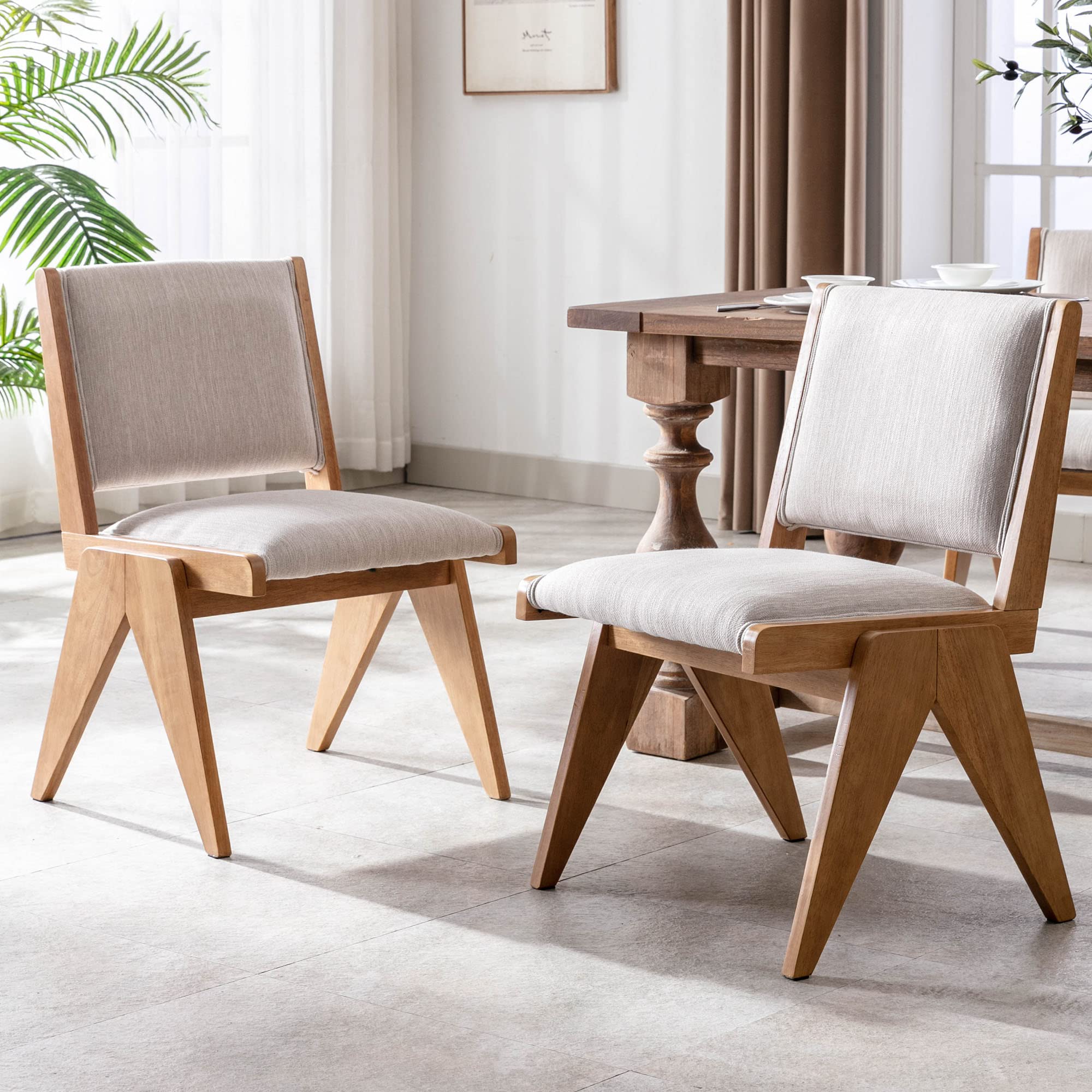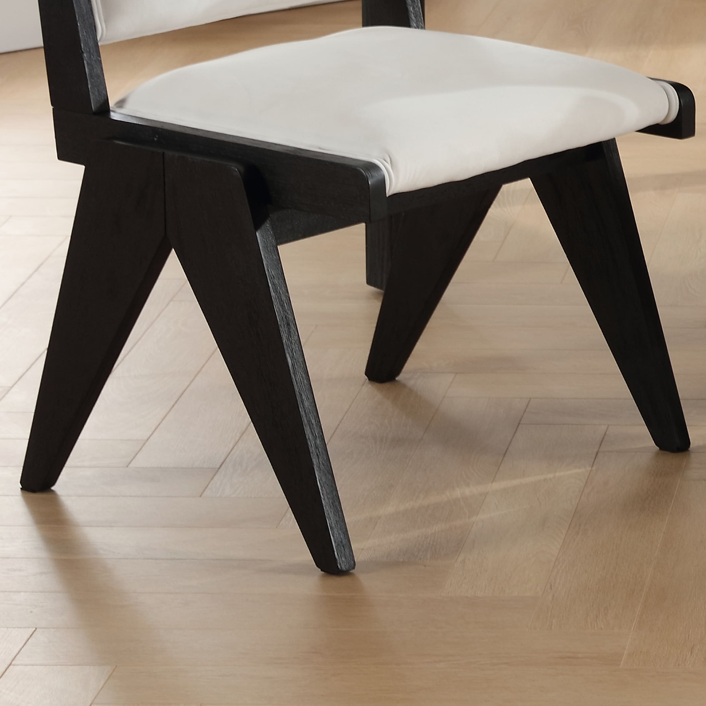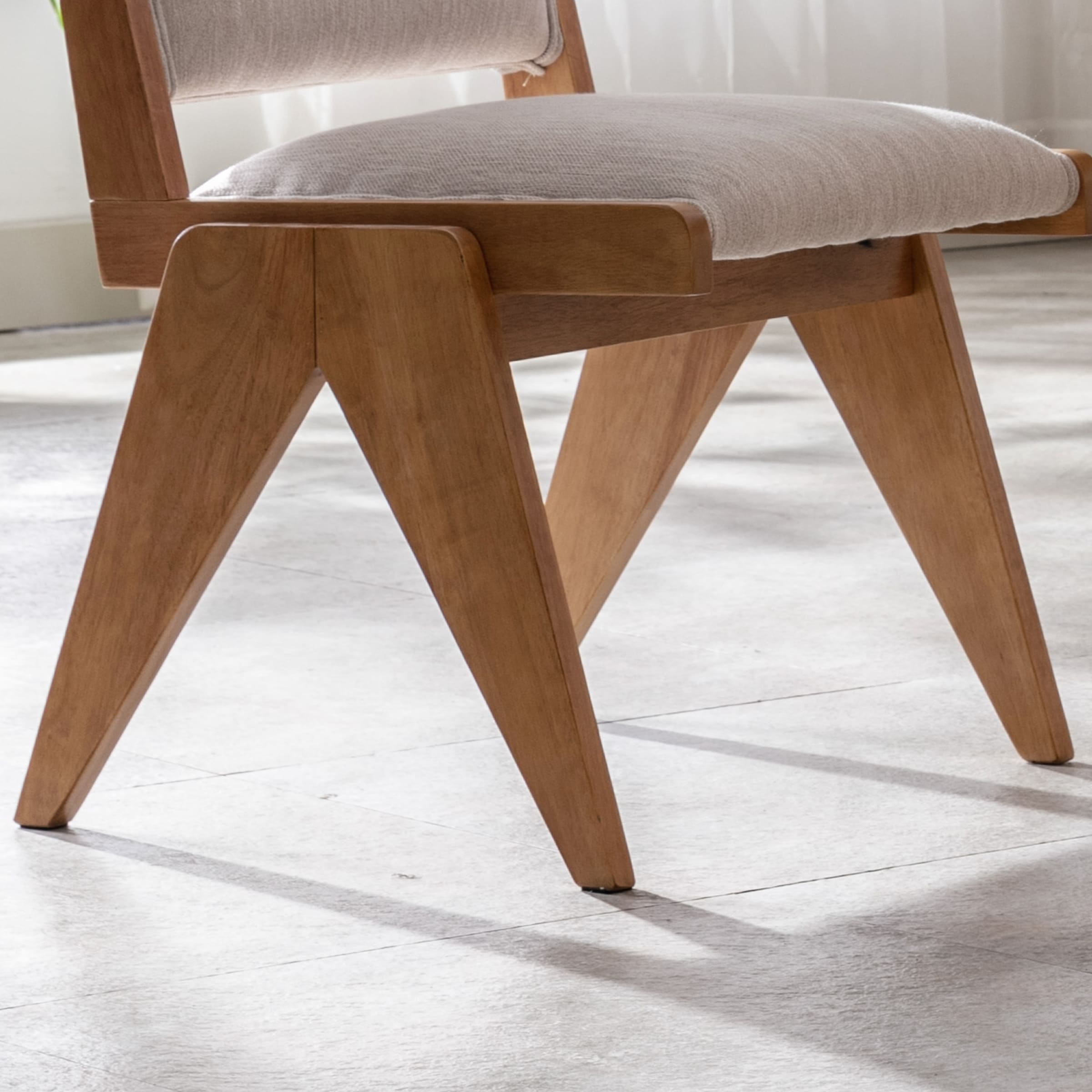 - Elegant design with upholstered seat, backrest, and inverted V-shaped wood legs.