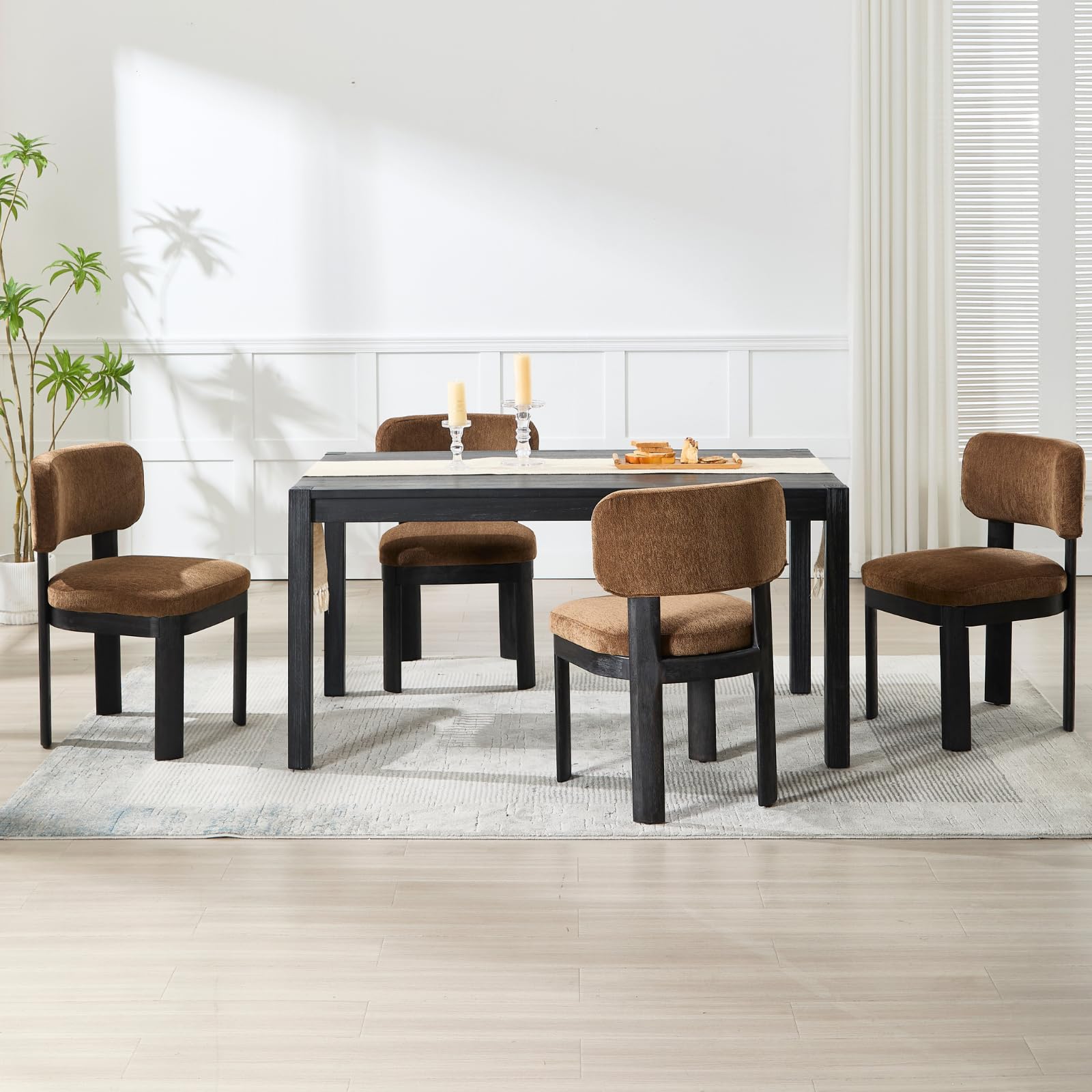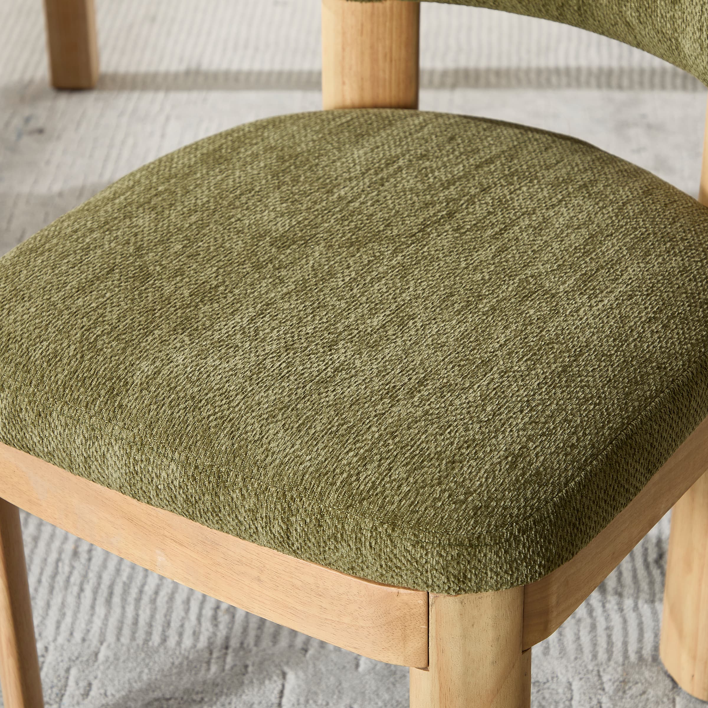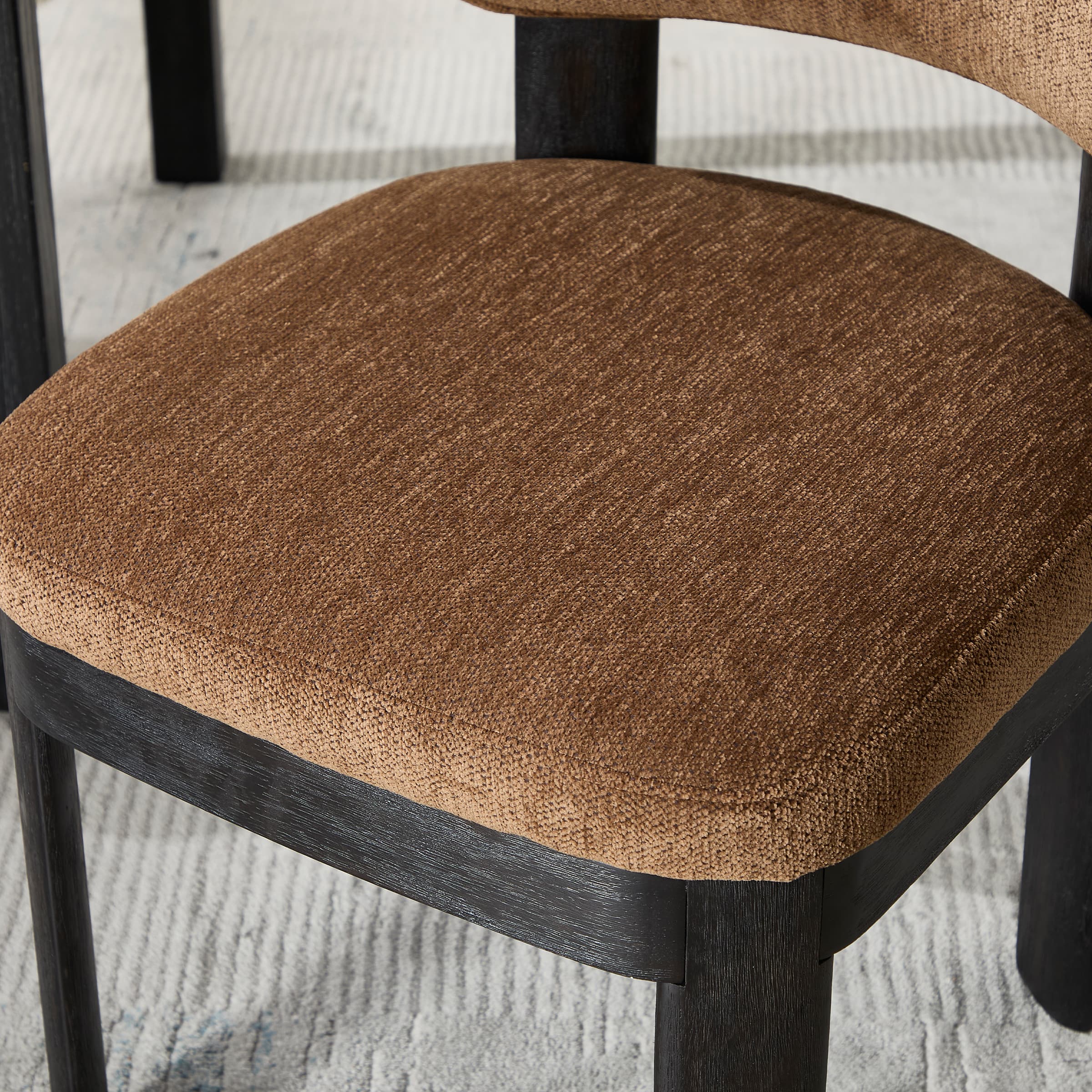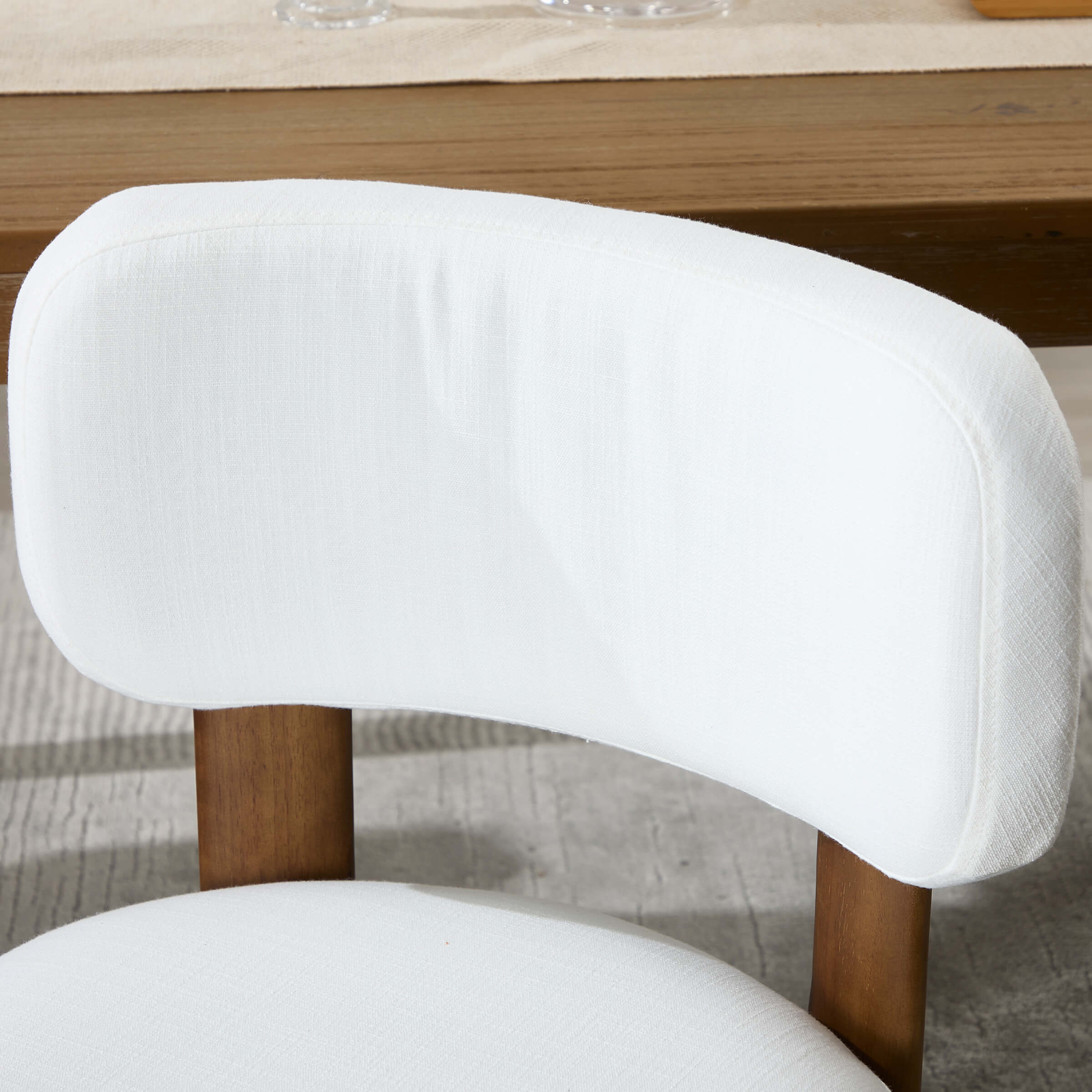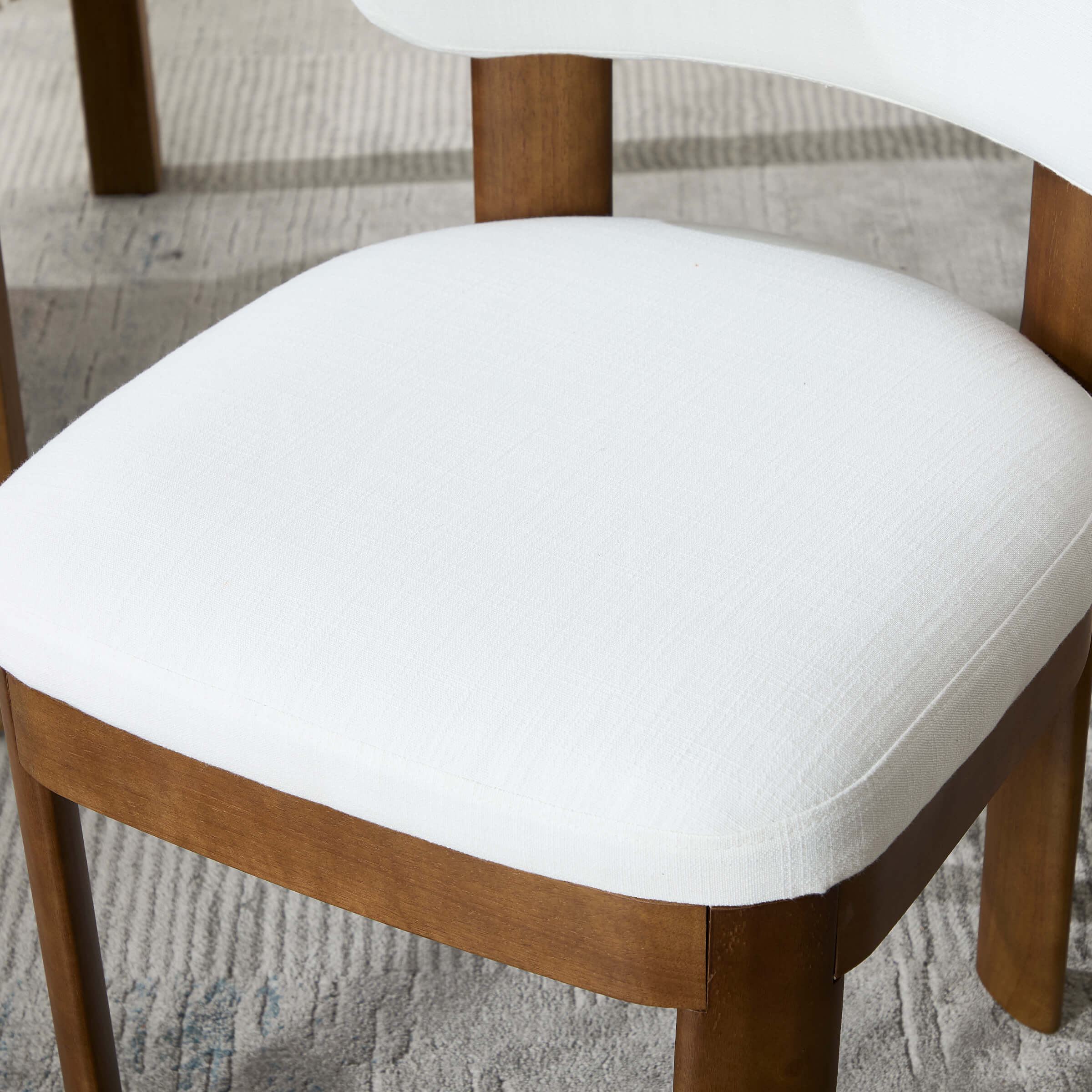 - Modern upholstered dining chairs with linen and chenille cushions and walnut legs.