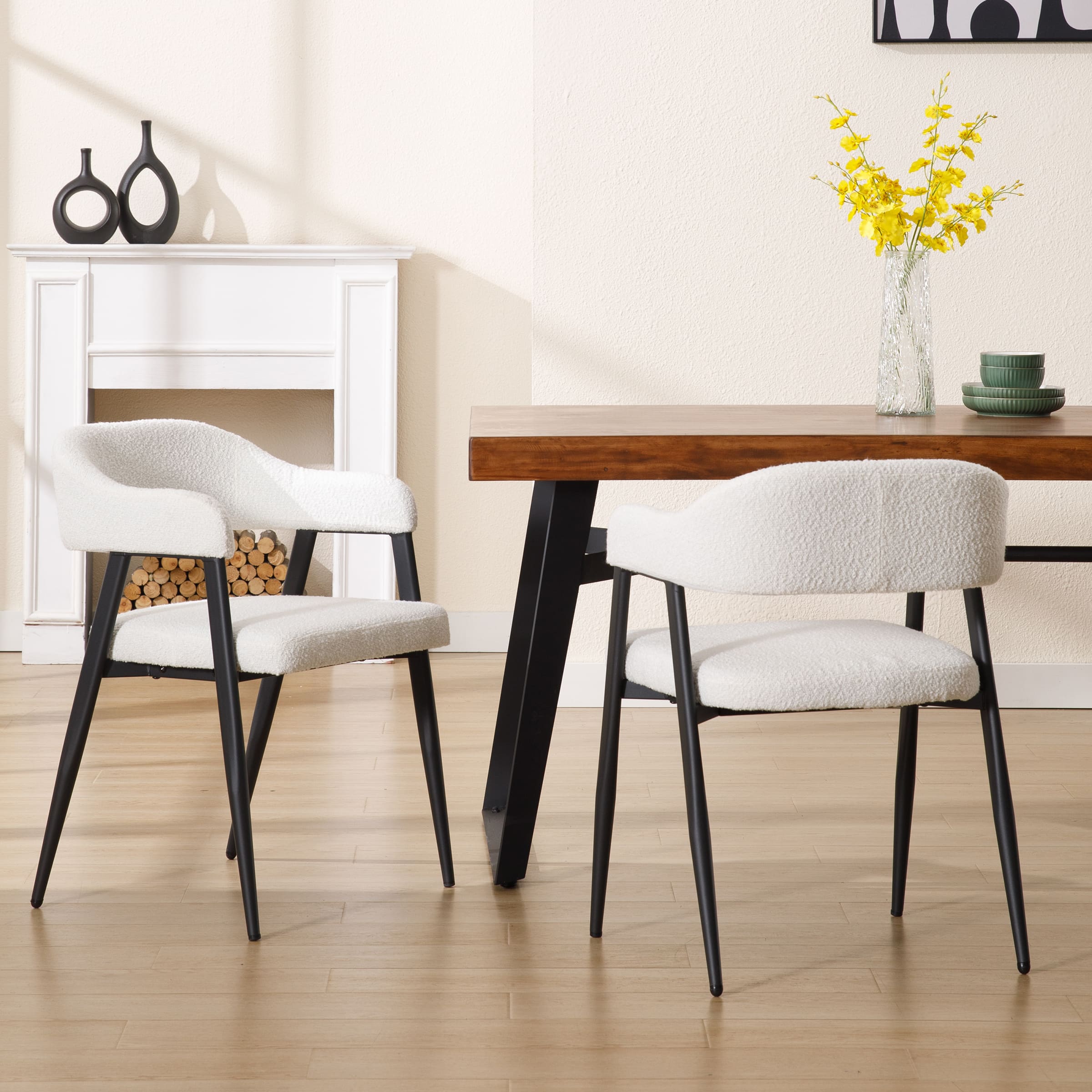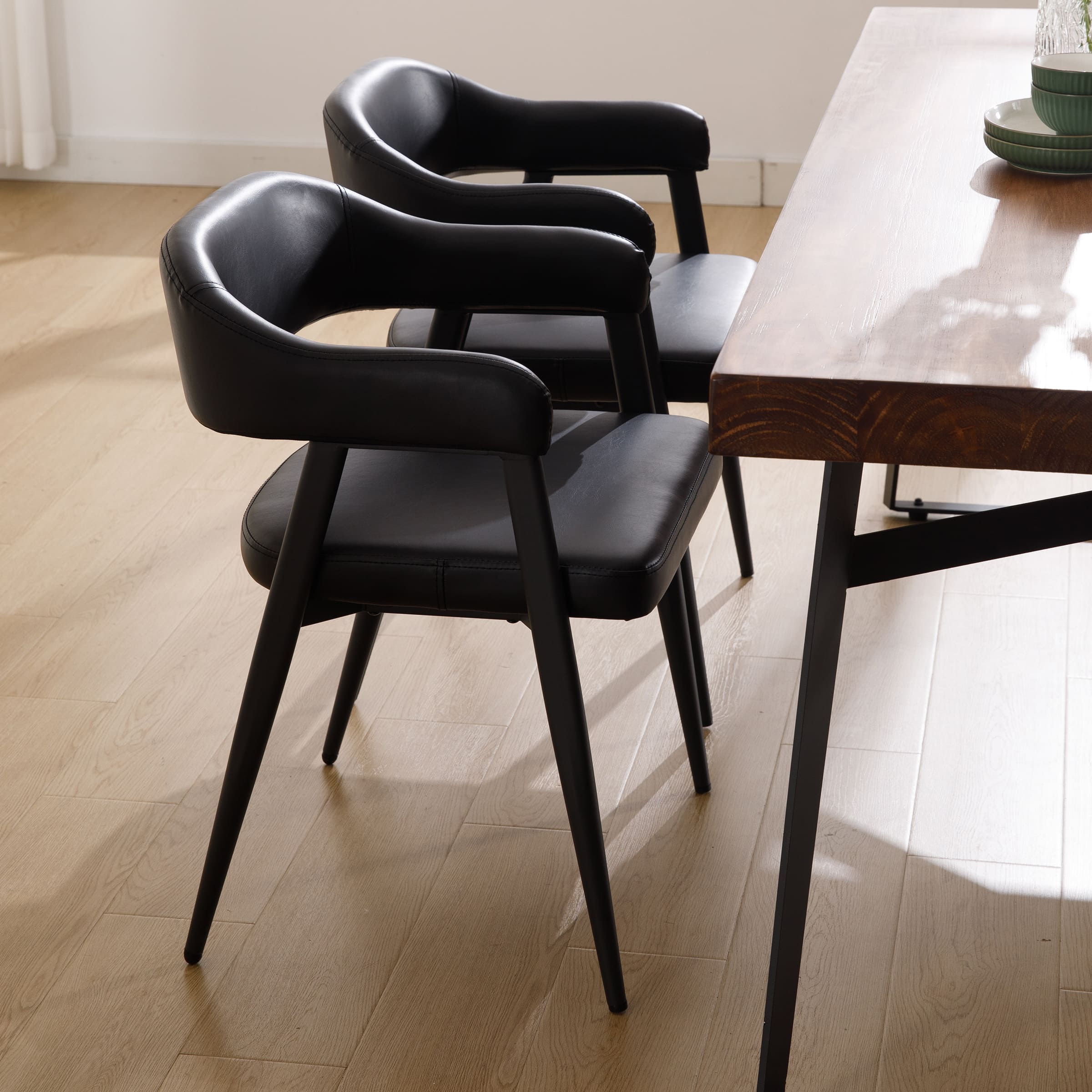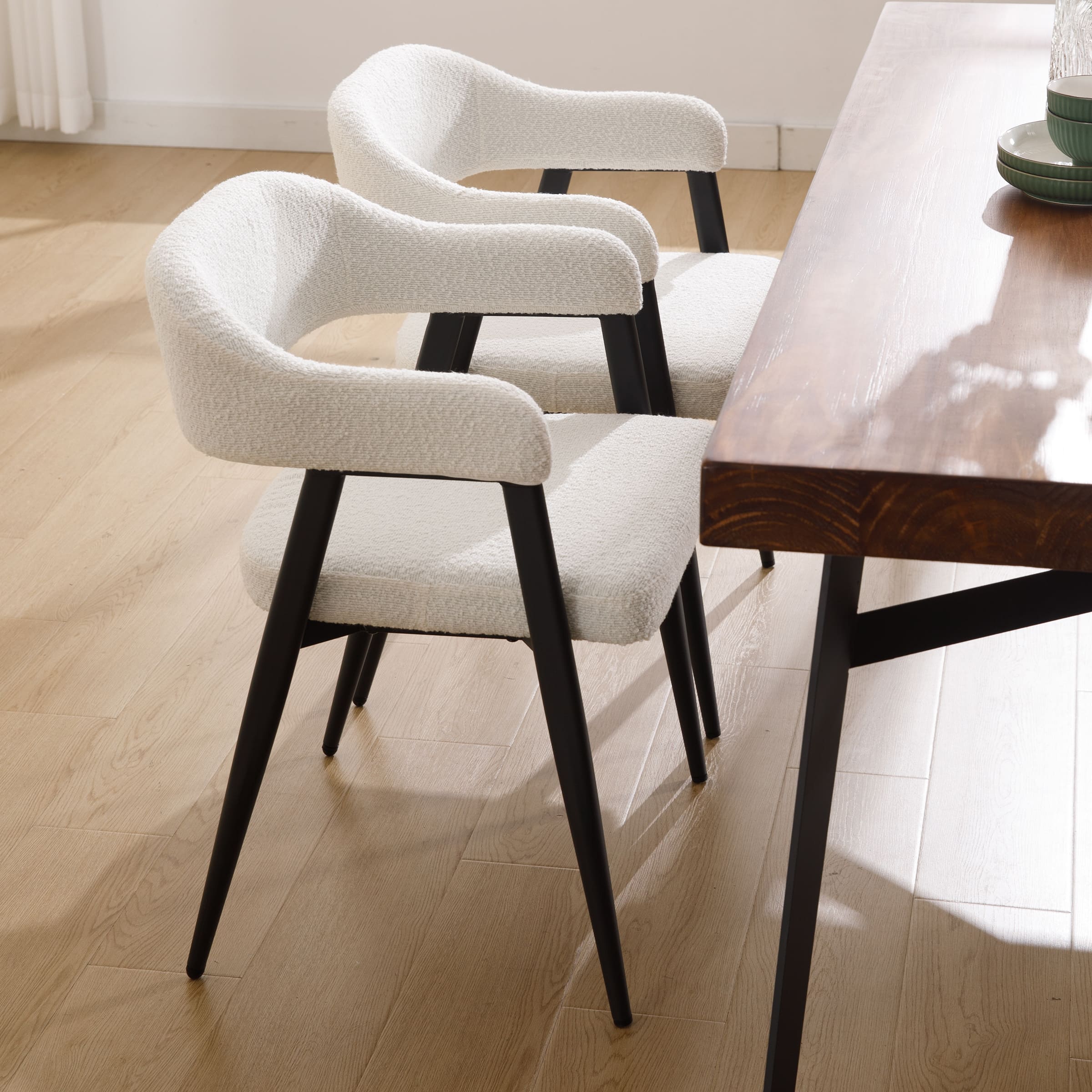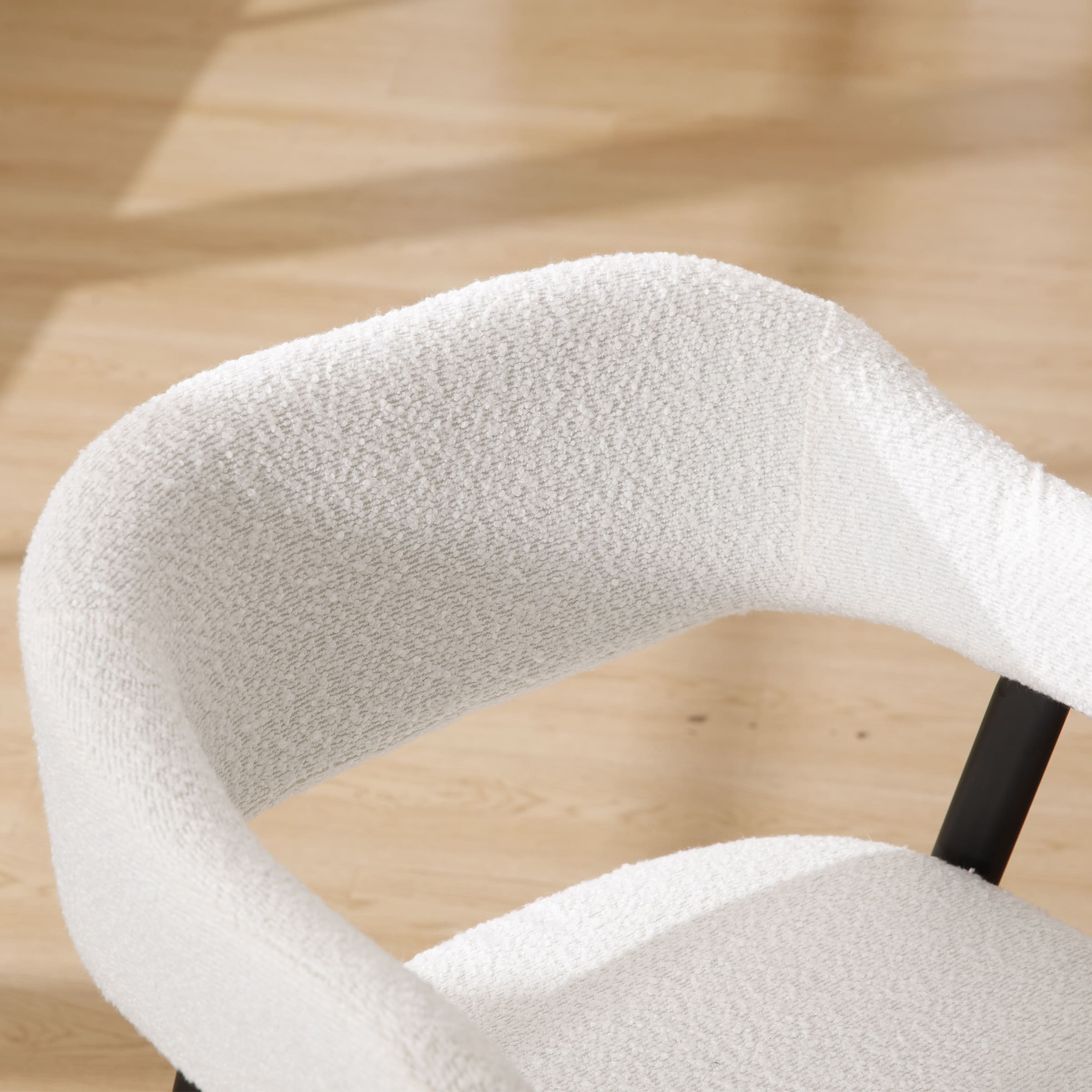 - Mid-century style with curved open back and eight-legged black iron frame.