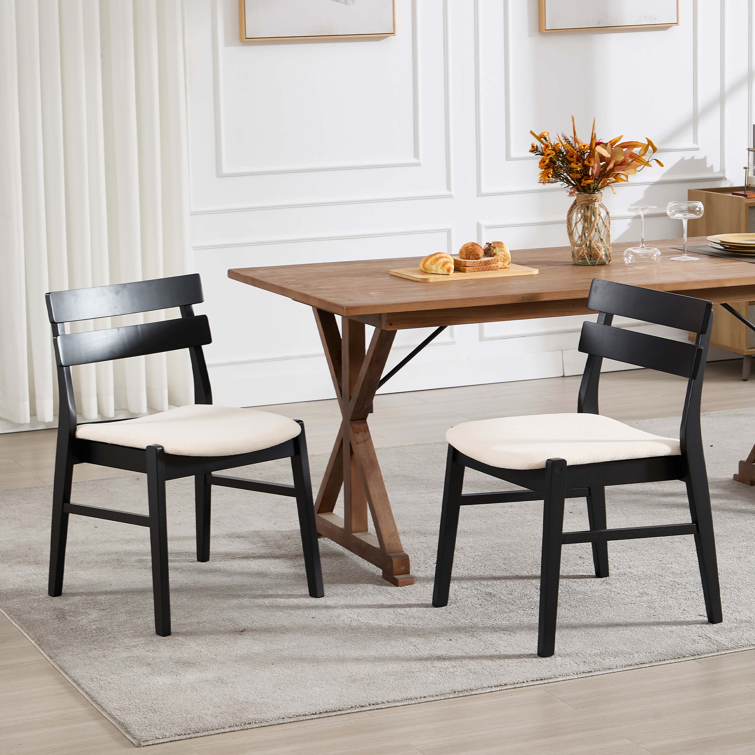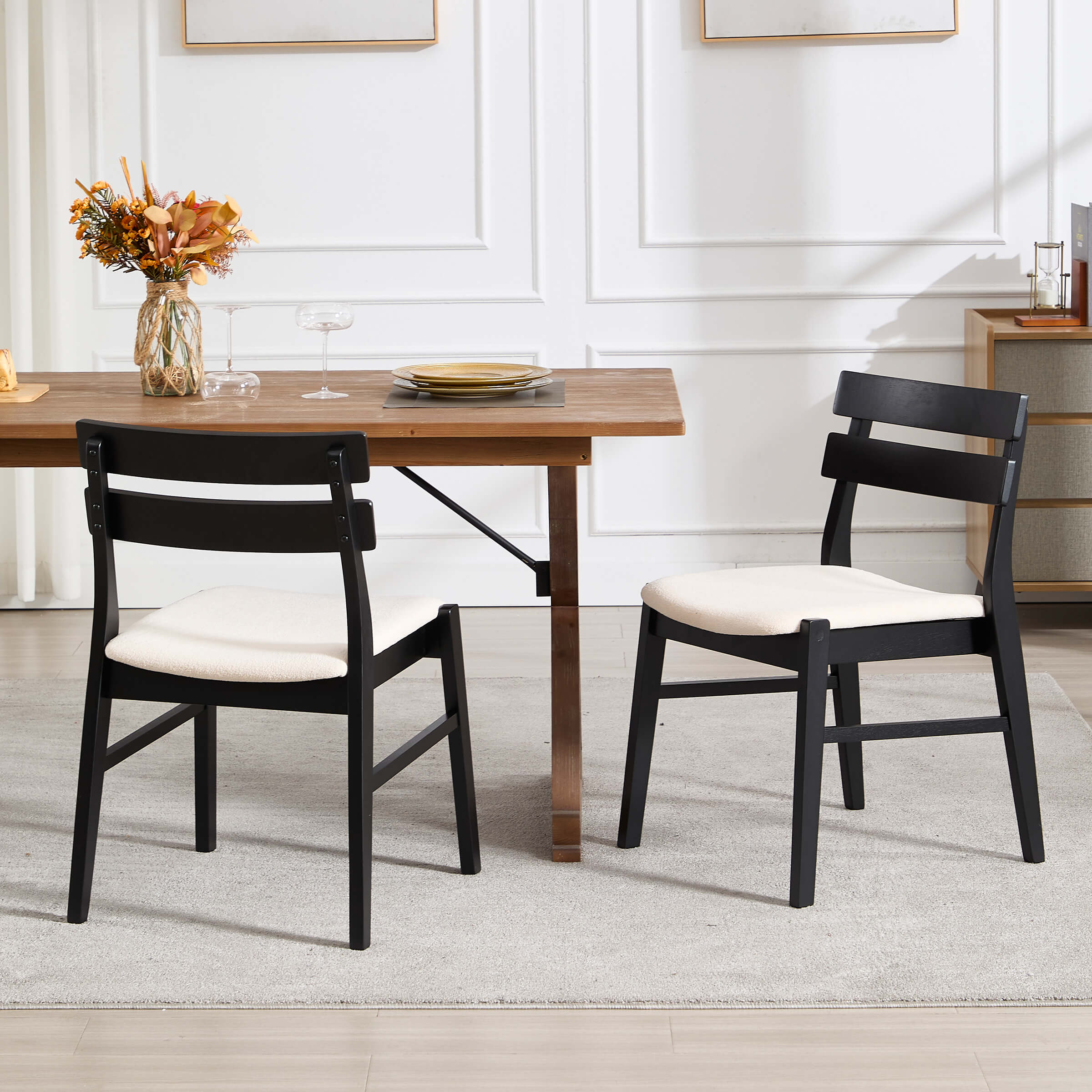 - Black walnut legs paired with white fabric cushions offer a versatile, stylish look.