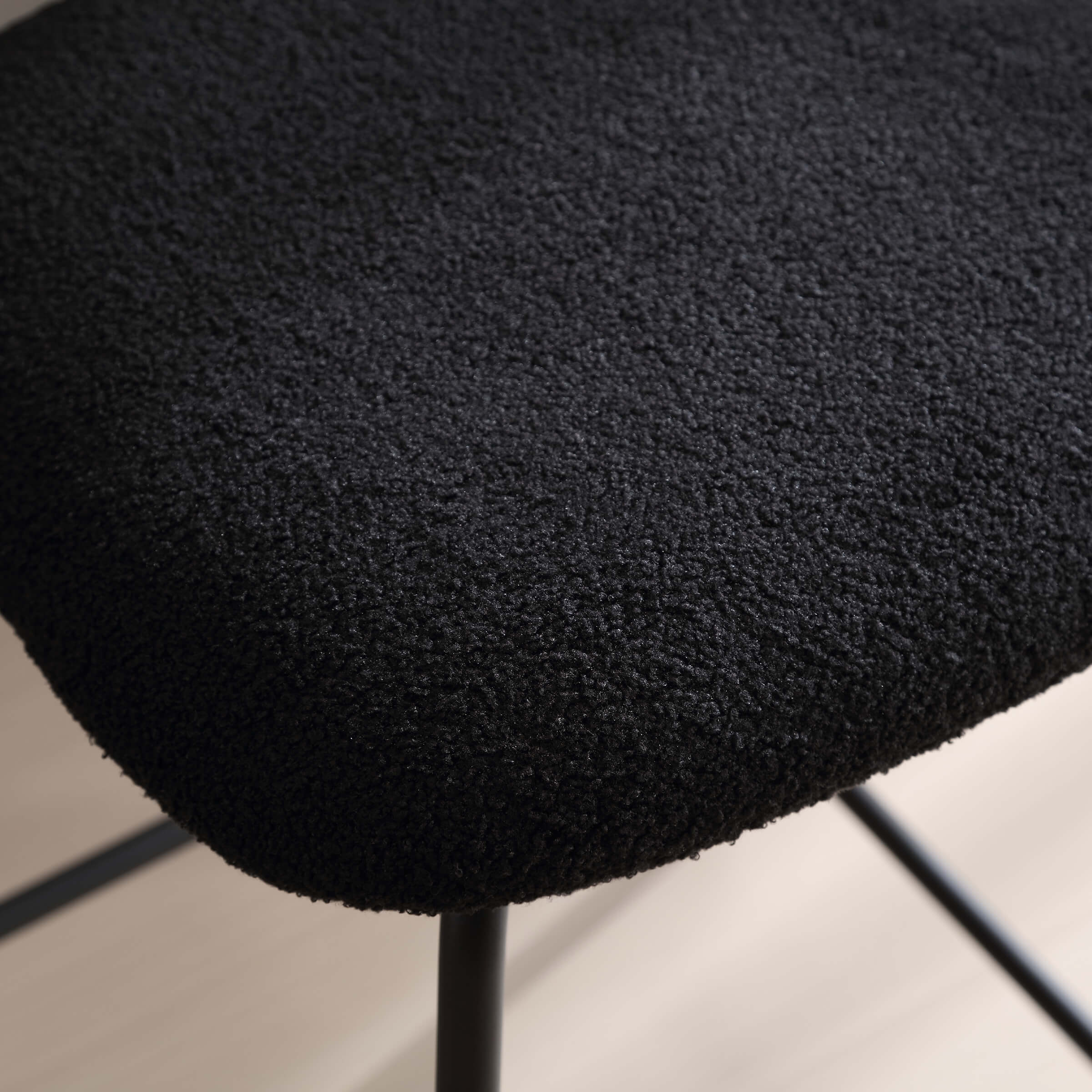 - Upholstered boucle seat with foam padding offers lasting comfort.