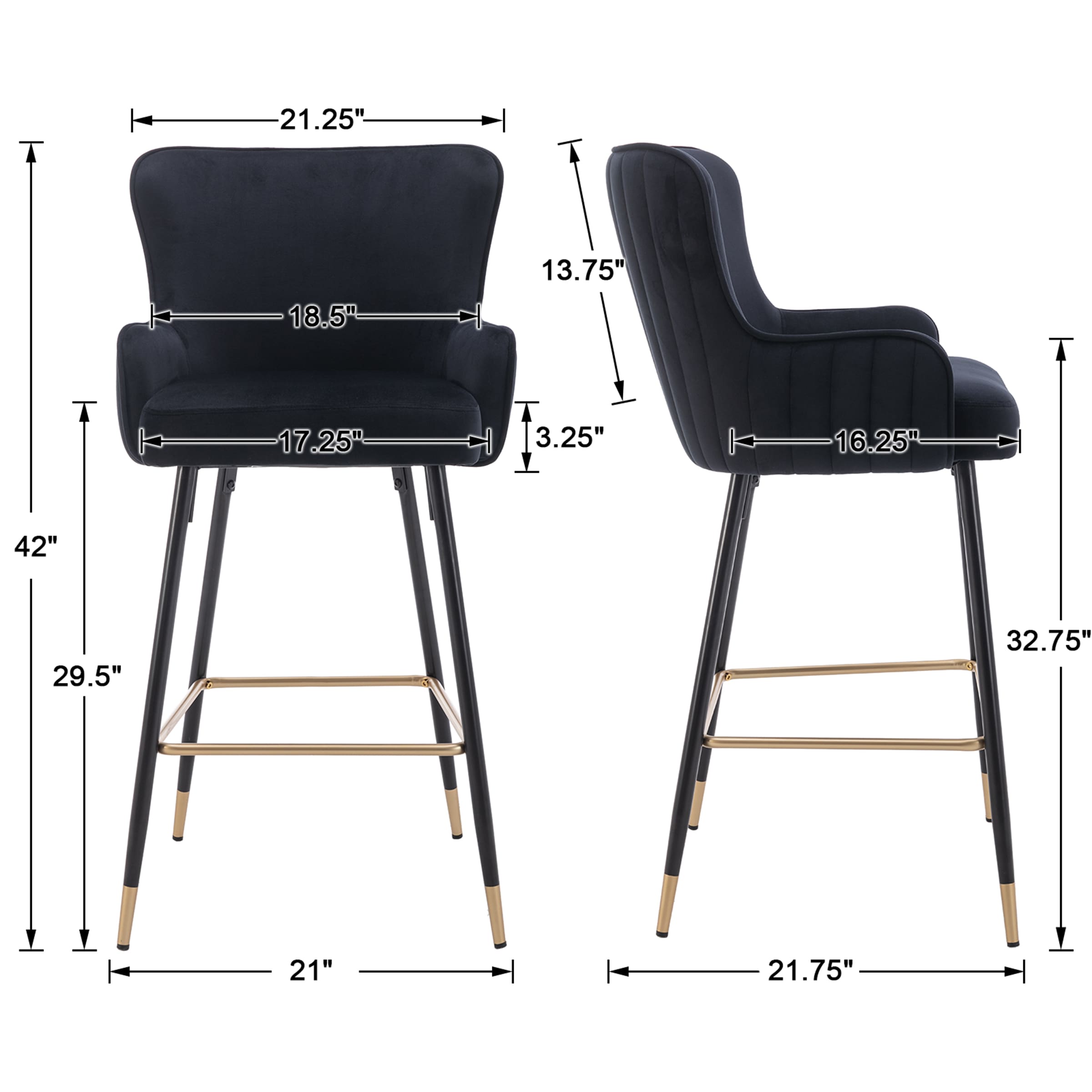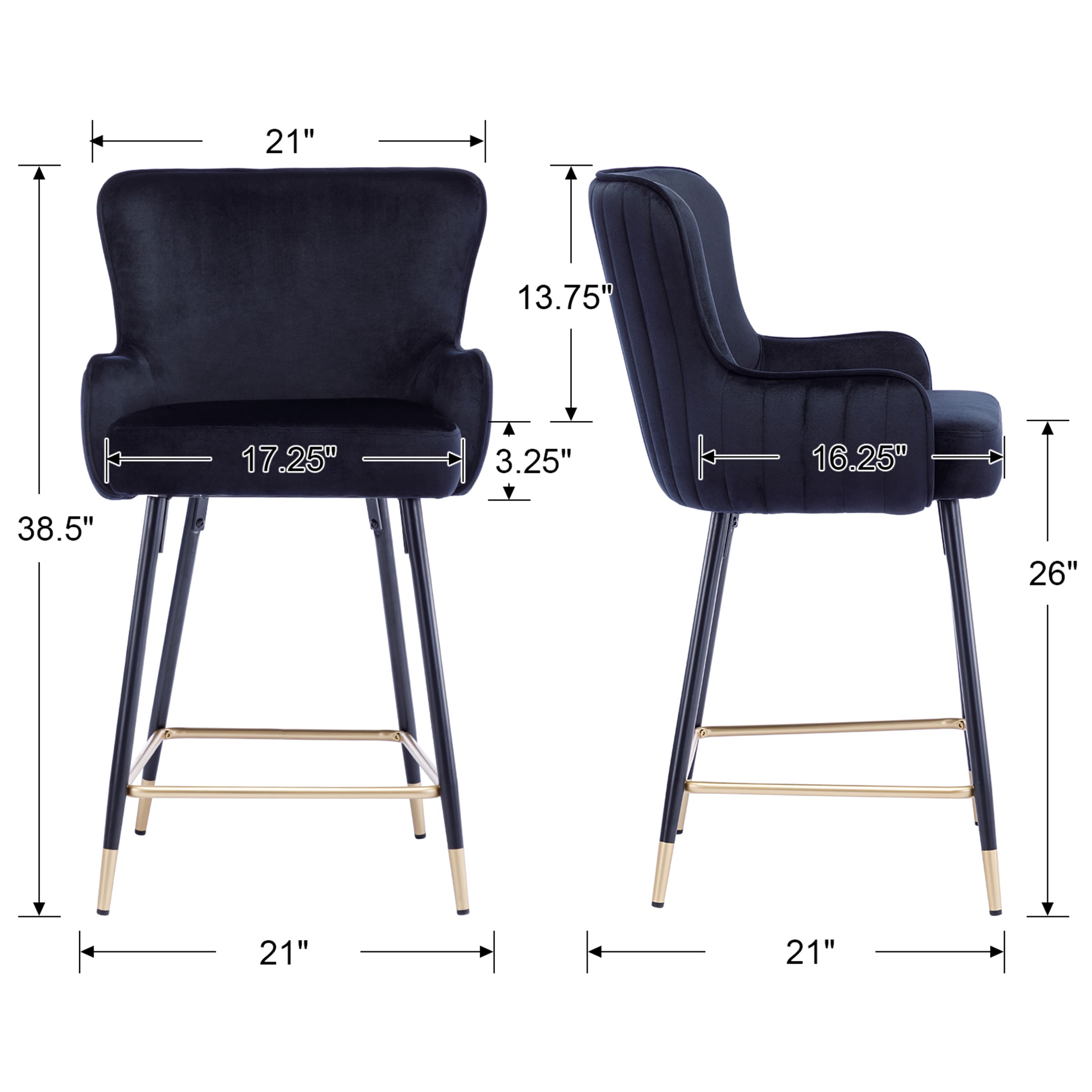 - Size: 21″W x 21″D x 38.5″/42″H; Seat height: 26″/32″.